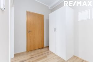 Anddyri: Parket á gólfi. Hvítur fataskápur.