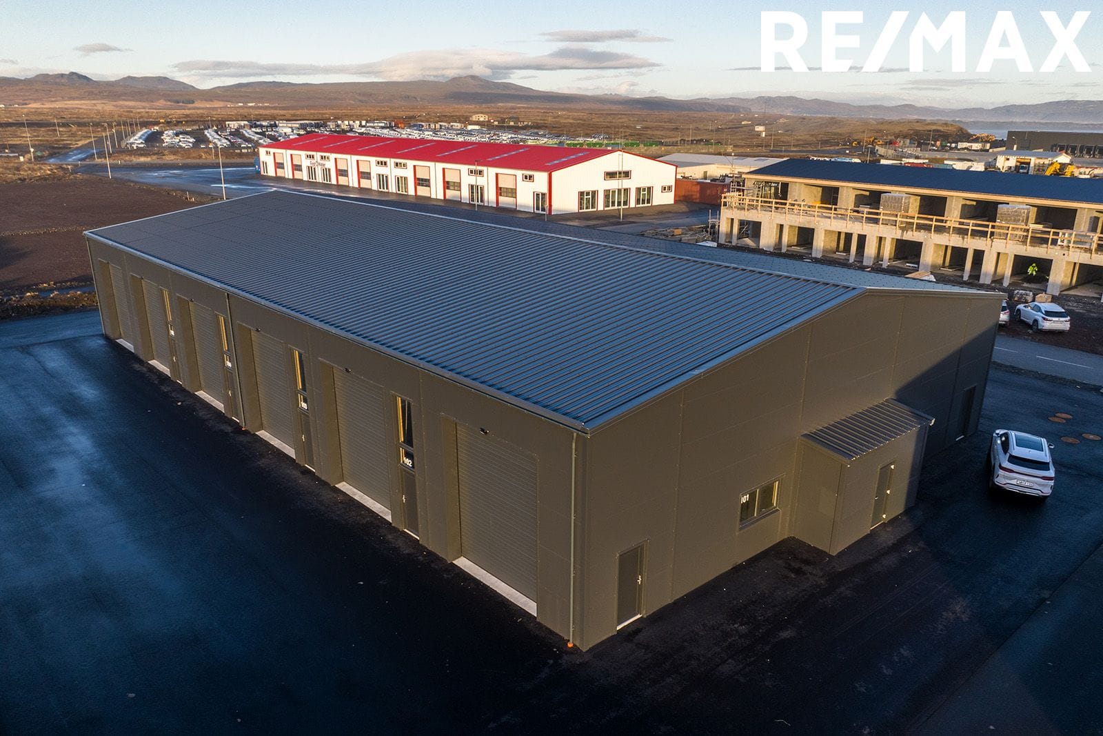 Uppbygging húss: Húsið er byggt ofan á steypta sökkla. Gólfplata: Hefðbundin staðsteypt plata, einangruð að innan með gólfhita. Neysluvatnslagnir eru lagðar samkv. verkfræðiteikningum, rör í rör. Útveggir/ þak / þakkantur / burðarvirki: Allir útveggir og þak hússins eru úr yleiningum, samlokueiningar frá Kingspan. Burðarvirki er límtré. Litur klæðninga að utanverðu er RAL7016 og að innan RAL 9010. Þakkantur er einfaldur, stálklæddur í sama lit og þakefni með utanáliggjandi álrennum og niðurfallsrörum í sama lit. Mænishæð er yfir 7 metrar. Gluggar og hurðir: Iðnaðarhurðir eru frá Héðni og er hæðin 4,35, litur RAL 7016 og rafmótoropnun. Gönguhurðir og gluggar eru úr viðhaldsfríu PVC plasti með tvöföldu einangrunargleri. Litur RAL 7016. Frárennslis og neysluvatnslagnir: Skólp‐ og regnvatnslagnir eru fullfrágengnar og tengdar fráveitukerfi í götu. Gólfniðurfall er fyrir innan allar innkeyrsluhurðir. Deilikistur fyrir neysluvatn frágengnar í hverri starfseiningu. Niðurföll af malbikuðum plönum frágengin og tengd fráveitukerfi. Hitakerfi: Gólfhitakerfi sem er innsteypt í botnplötuna á járnagrind komið í hverja starfseiningu, deilikista með hringrásarkerfi tengd í hverri einingu. Kerfi stjórnað með handvirkum ofnloka. Slökkvitæki fylgir. Sér frádráttamælir fylgir hverju bili og er staðsett í inntaksrými. Rafmagn: Aðaltafla með mælum fyrir hverja starfseiningu frágengin í inntaksrými. Greinatafla frágengin í hverri starfseiningu með einum þriggja fasa tengli við hliðina. Tenglar á nokkrum stöðum í hverri starfseiningu skv. grunnhönnun raflagnahönnuðar. Full lýsing (LED) í hverri starfseiningu skv. grunnhönnun raflagnahönnuðar sem uppfyllir viðkomandi reglur. Raflagnir lagðar í aðgengilegum kapalstigum, auðvelt að breyta ljósum, slökkvurum, tenglum og slíku ef þurfa þykir. Útiljós við hurðir á hverri starfseiningu sem hægt er að stjórna frá viðkomandi einingu og tengist viðkomandi mæli (ekki sameign). Lóð: Afhendist malbikuð. Virðisaukakvöð hvílir á húsinu. Skipulagsgjald: Kaupandi greiðir skipulagsgjald þegar það verður lagt á sem er 0,3% af væntanlegu brunabótamati.