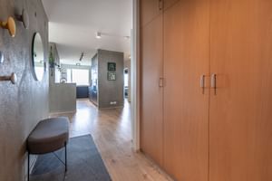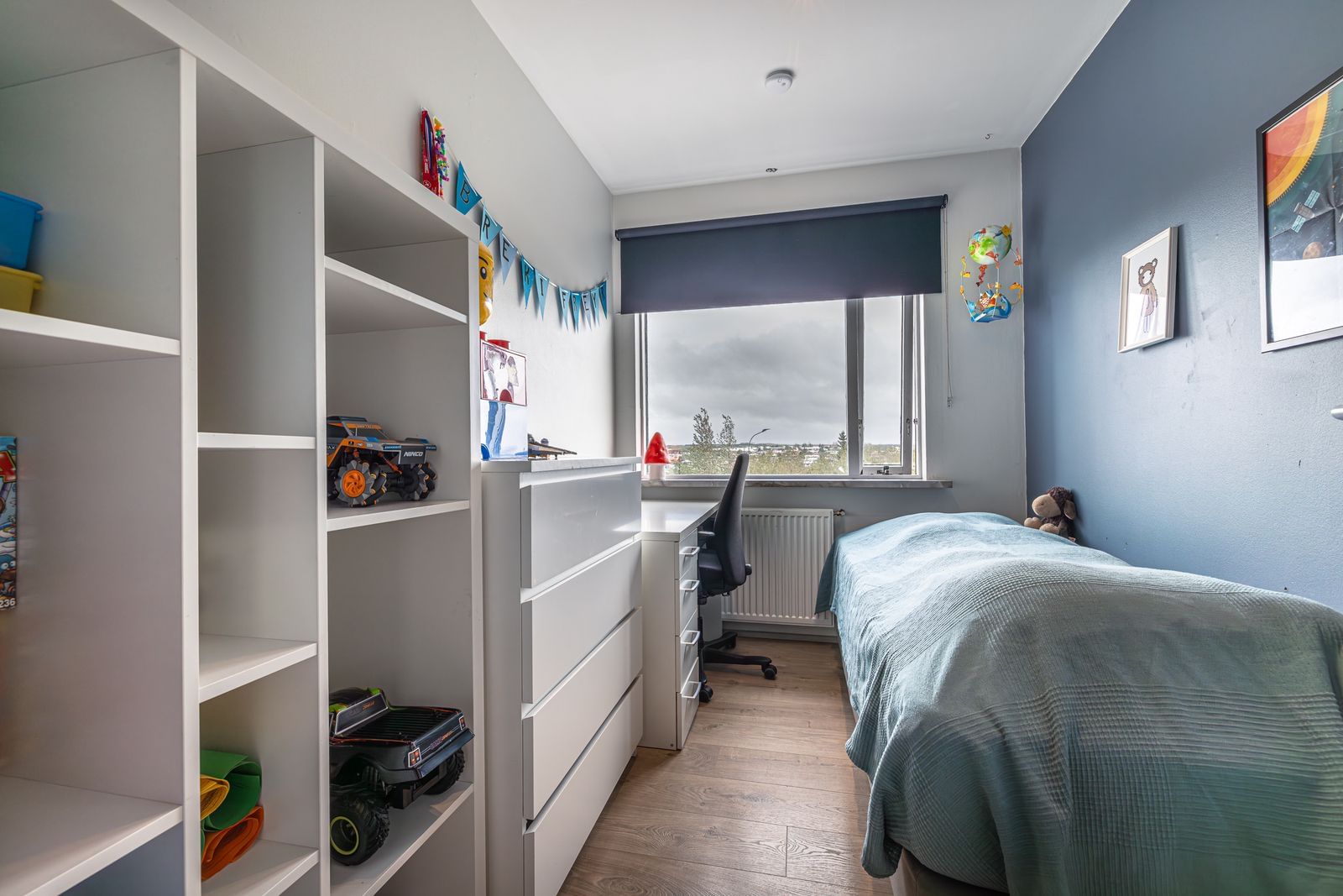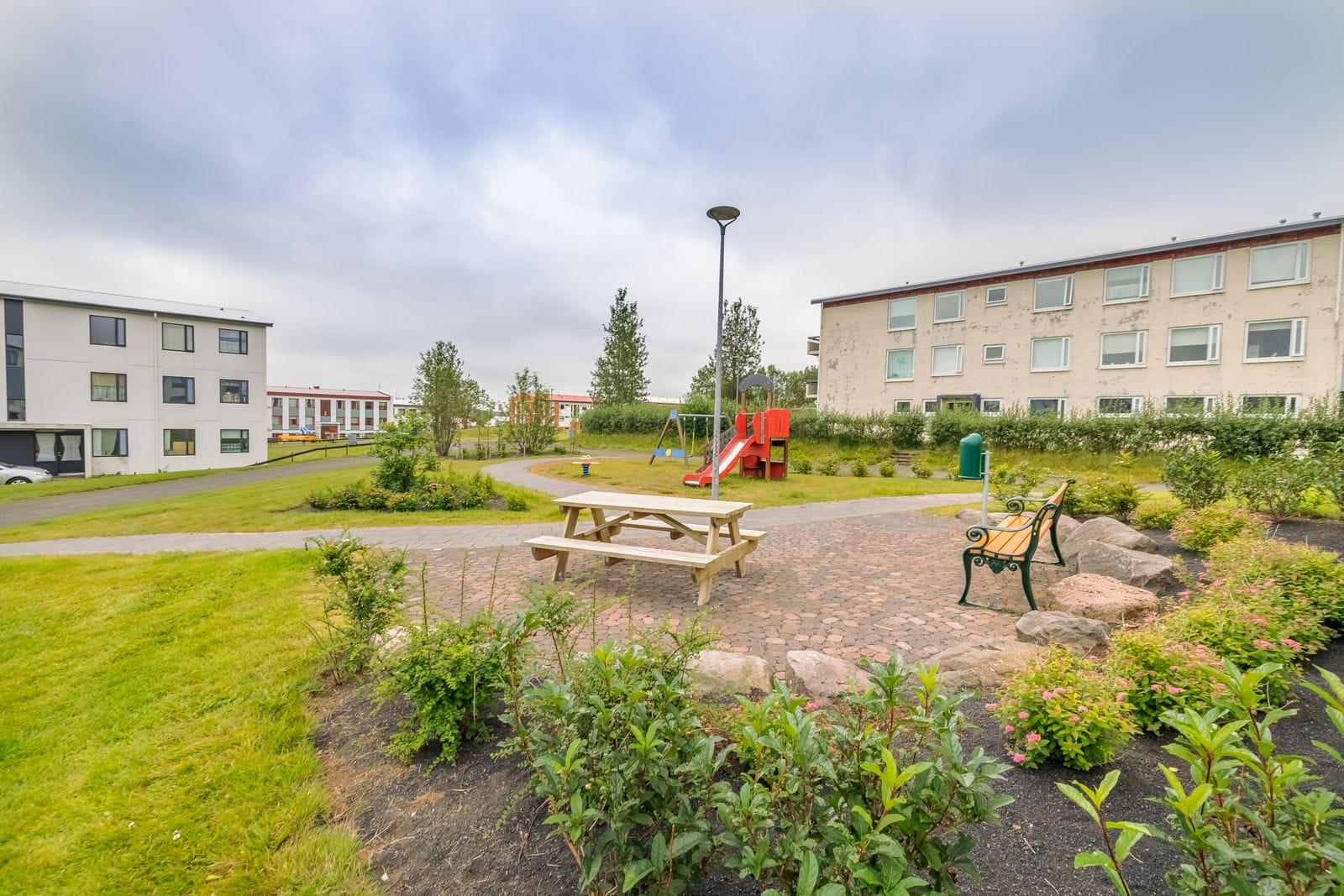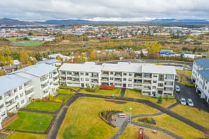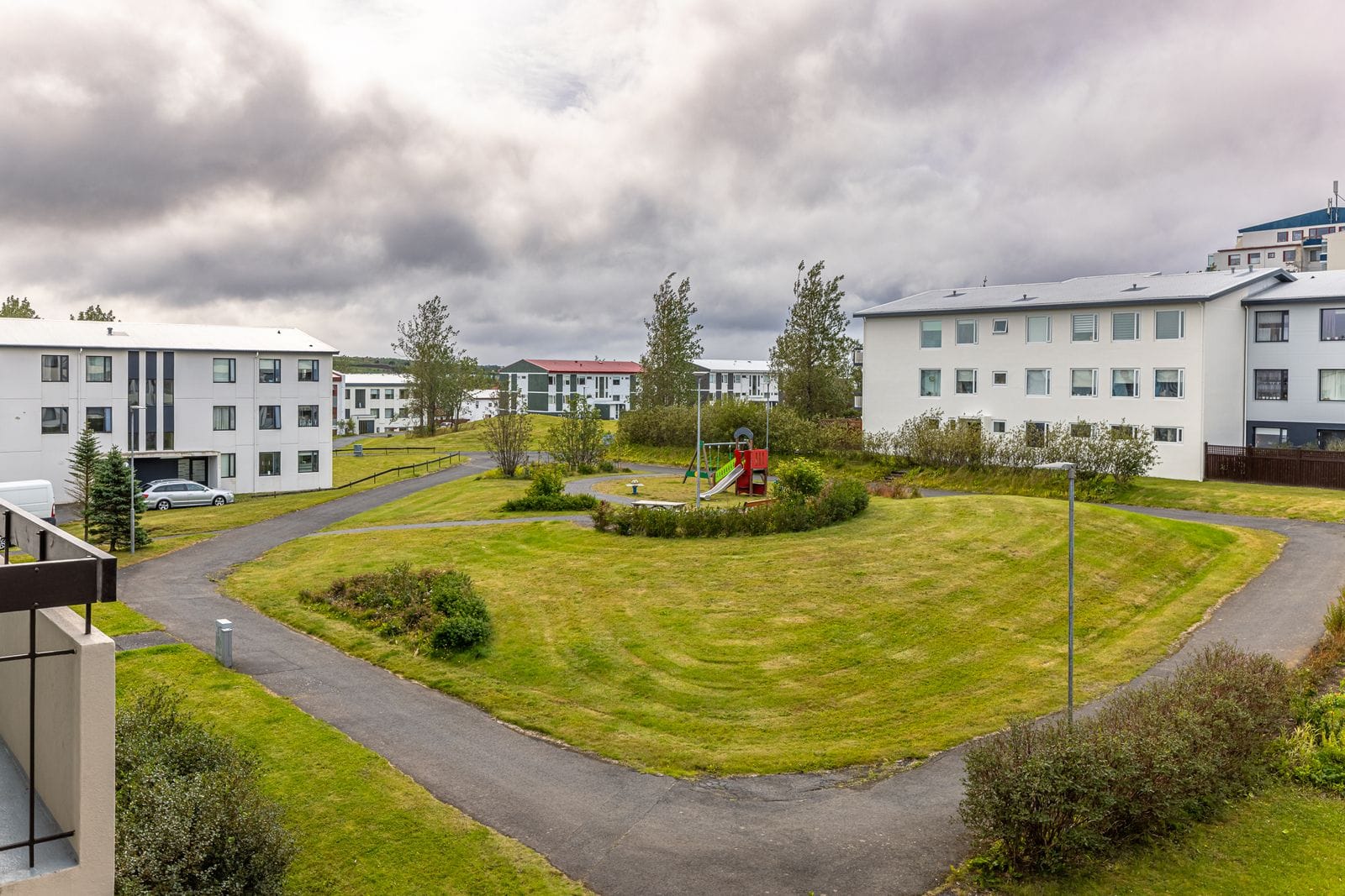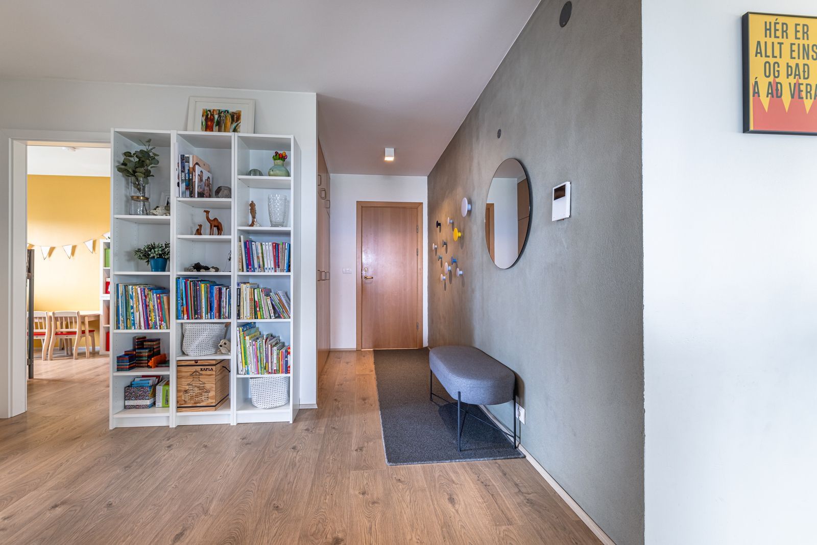 Svefnherbergi: Þrjú svefnherbergi, fatahengi og skúffueining í hjónaherberginu og fataskápur í öðru barnaherberginu.