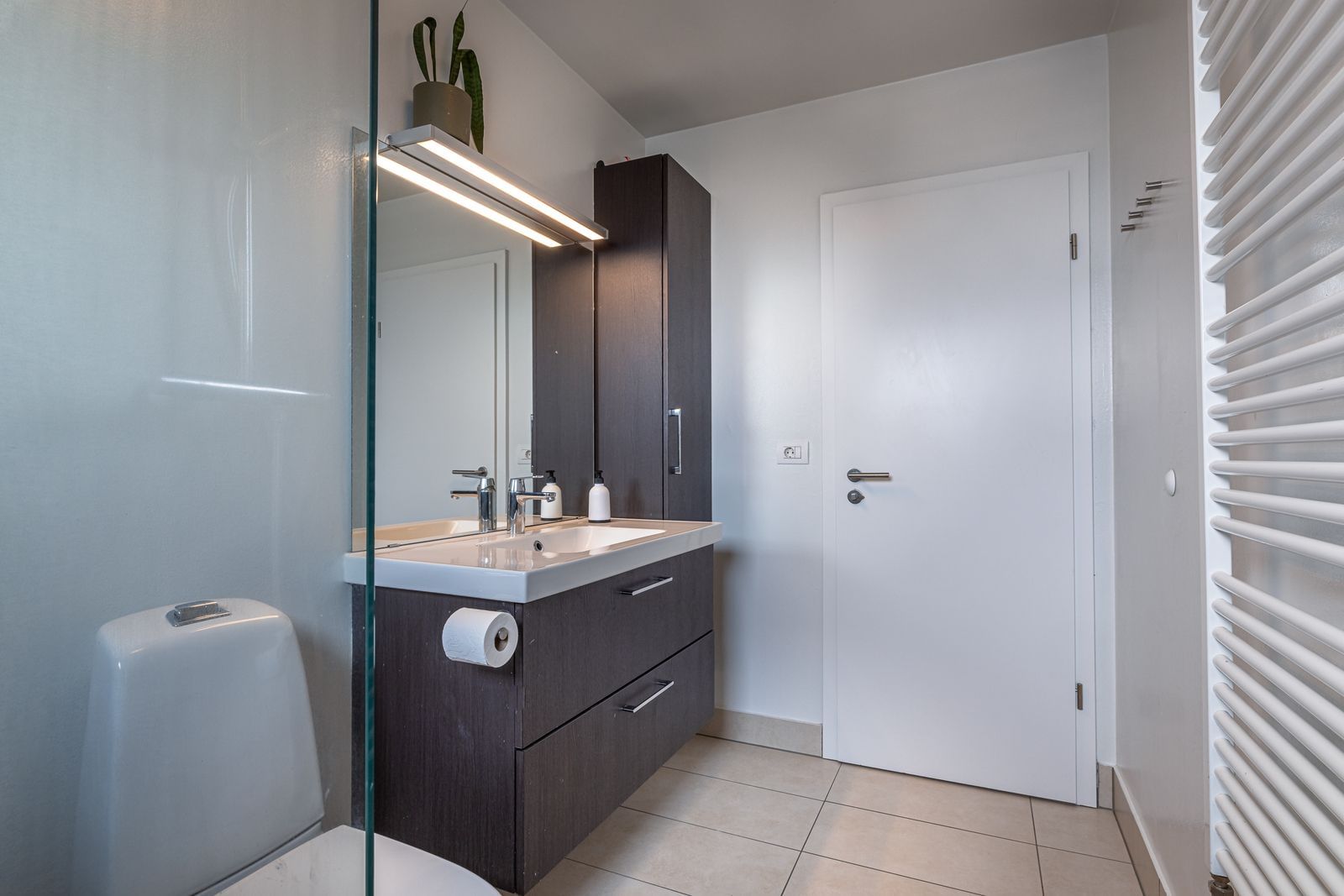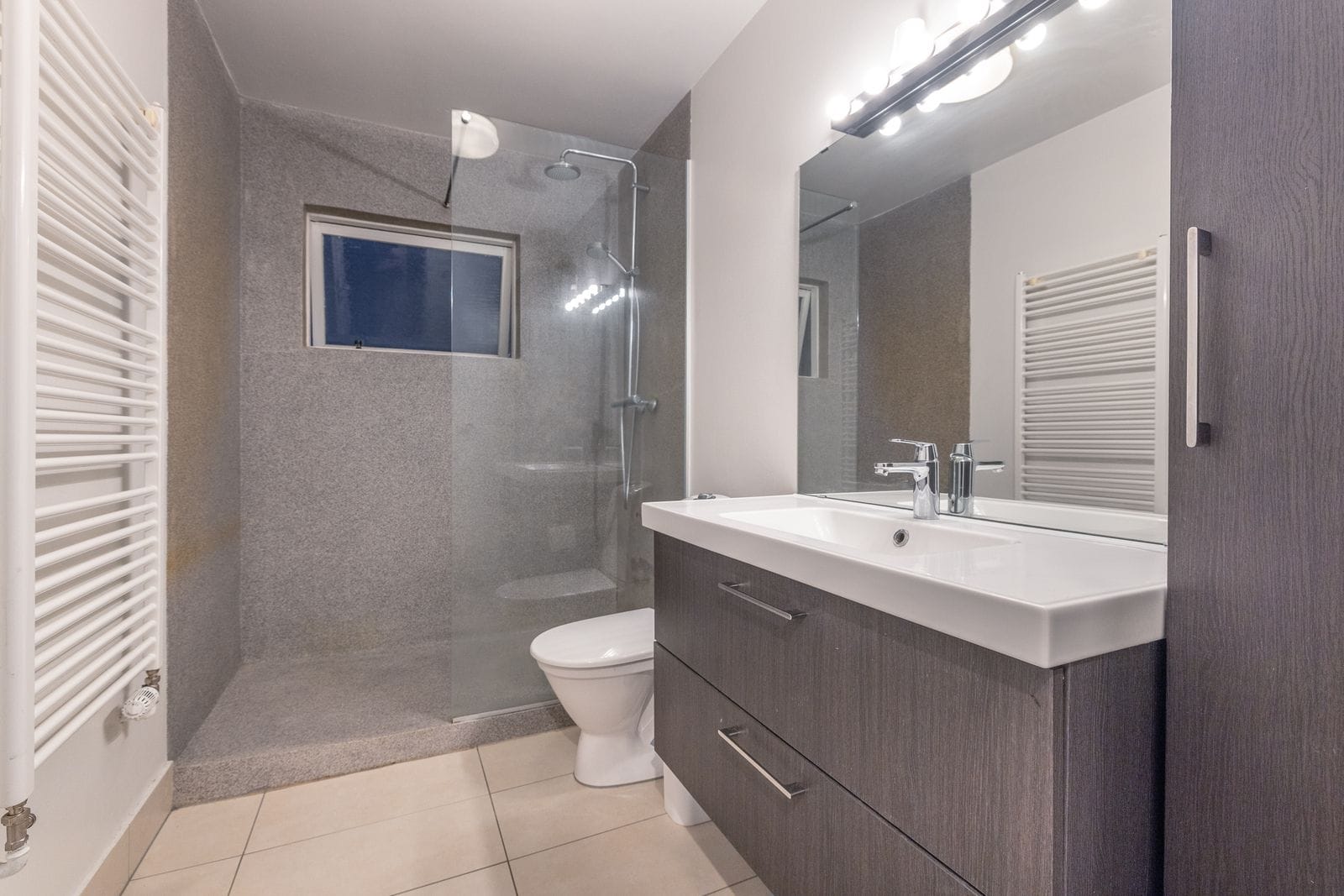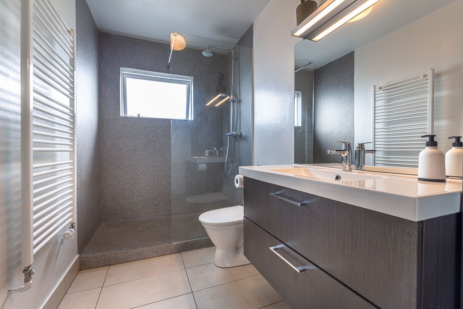 Baðherbergi: Nýlega flísalagt gólf, steyptur sturtubotn, handklæðaofn og falleg innrétting.