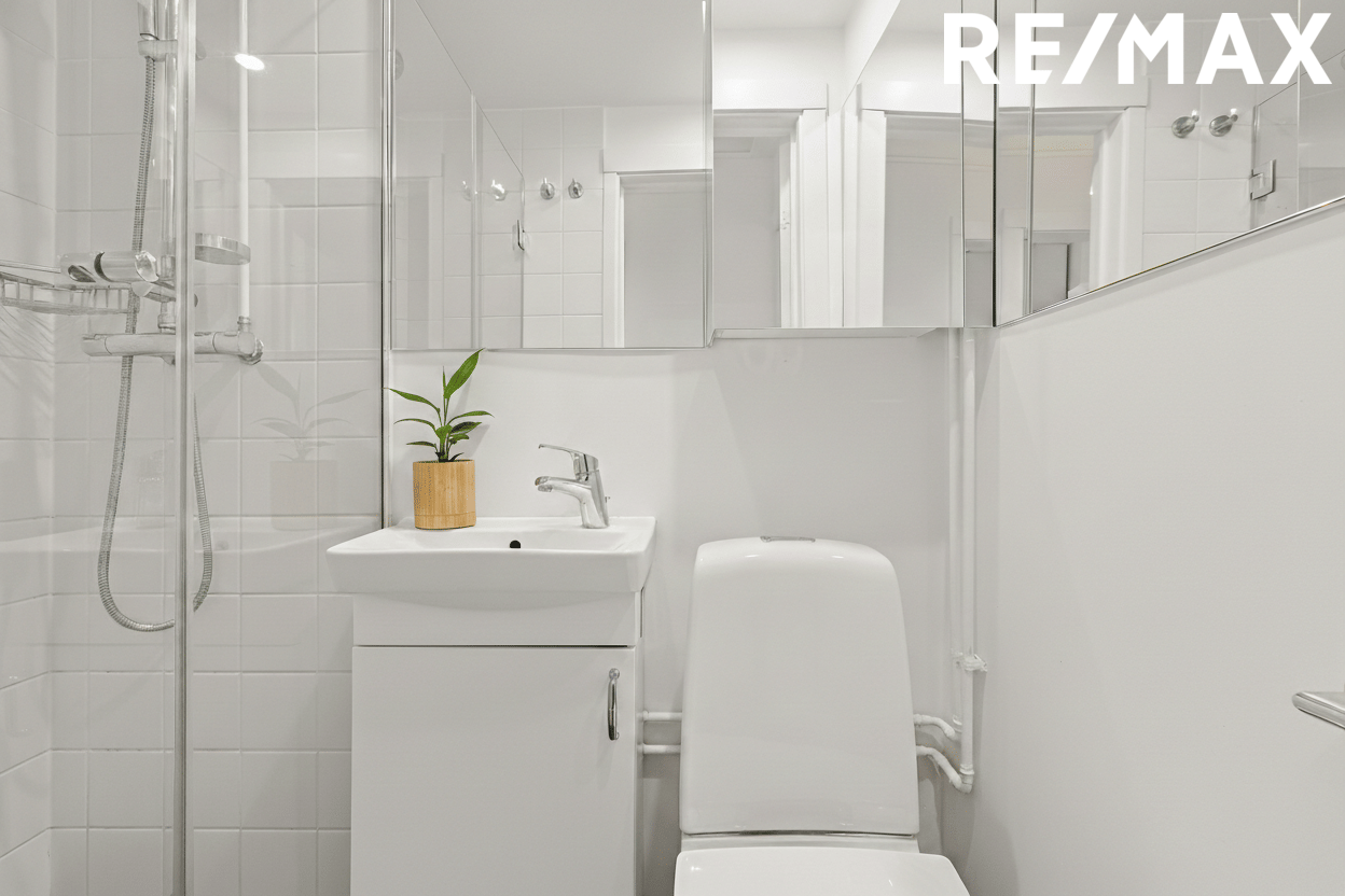 Baðherbergi: Uppgert af núverandi eigendum. Ný glerhurð og gler á sturtu, endurnýjað salerni, handlaug, speglar og speglaklæddur skápur sem gefa rýminu aukna vídd. Afar vel nýttir fm. Flísar á gólfi og í sturtu.