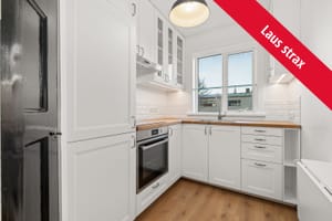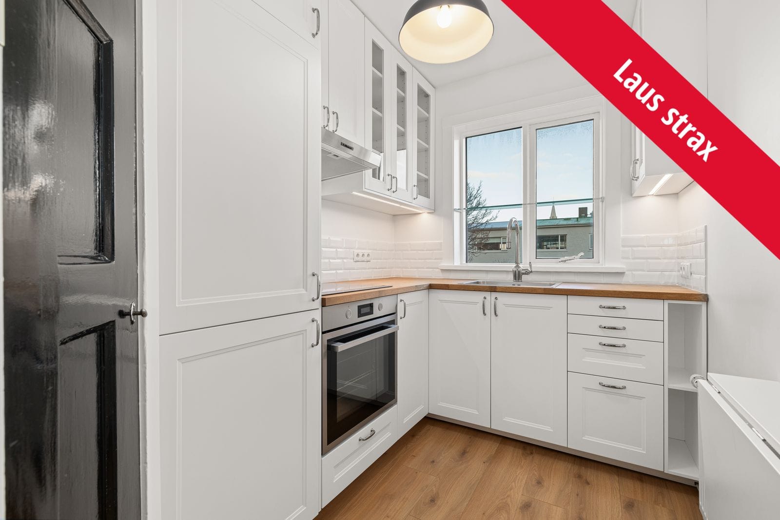 Eldhús: Endurnýjað eldhús, hvít innrétting með viðarborðplötu. Flísar eru á milli efri og neðri skápa. lýsing undir efri skápum. Gluggi með glerhillu. Keramik helluborð og bakaraofn staðsettur undir borðplötu, gufugleypir, innbyggður ísskápur með frysti. Vegghengt niðurfellanlegt borð á vegg. Búrskápur er í horni við inngang, uppgerður með svartlakkaðri hurð og gefur það eldhúsinu og íbúðinni sjarma og sál með tengingu við gamla tíma. Þar er styrking á rafmagni (viðbætur við rafmagnstöflu) og sést í nýjar lagnir sem eru þar utanáliggjandi faldar í skápnum og því vel aðgengilegar. Snilldarfrágangur með aðgengi.