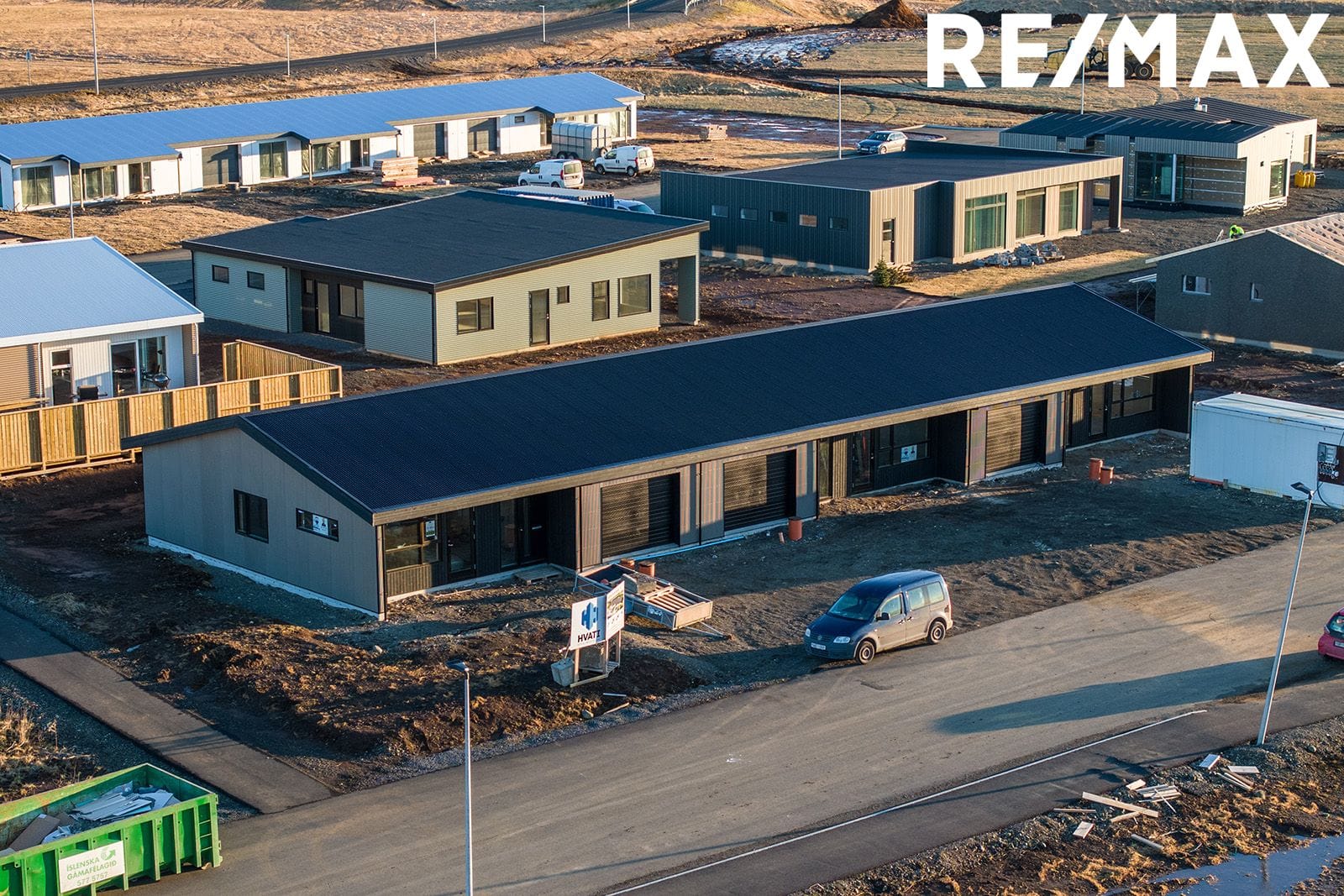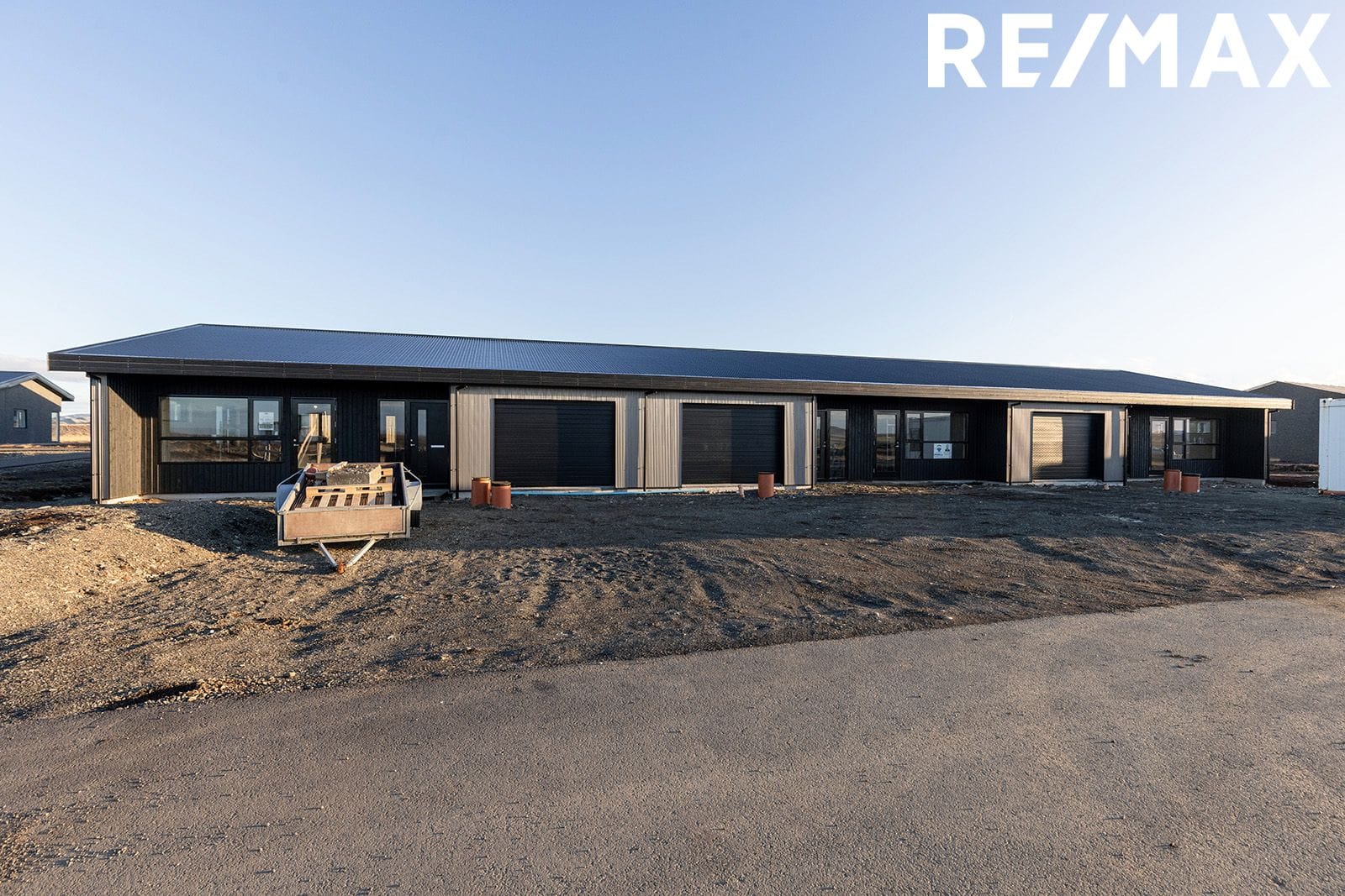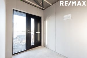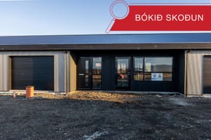Nánari lýsing: Sökklar: Sökklar eru steyptir og einangraðir að innan. Gólfplata: Gólfplata er steypt og einangruð með gólfhita í. Neysluvatnslagnir eru lagðar skv. verkfræðiteikningum, rör í rör. Útveggir: Allir útveggir hússins eru úr timburgrind. Húsið er klætt að utan með litaðri grárri smábáru frá Húsasmiðjunni, timbur inn í innskoti við innganga. Gluggar og hurðir: Allir gluggar og útihurðir eru úr ál/tré. Tvöfalt verksmiðjugler frá viðurkenndum framleiðanda er í húsinu og flyst ábyrgð þess áfram til kaupenda. Söluaðili er Gluggatækni. Litur að utan er RAL 9005 (svart) og sami litur að innan. Þak: Tvíhalla þak er á húsinu og er það lituð stálklæðning í lit RAL 9005 (svart). Þakkantur: Þakkantur er timburklæddur með svörtum lit Niðurföll og þakrennur: Þakniðurföll eru úr áli frá Hagblikk og rennur eru úr plasti frá Húsasmiðjunni. Lóð: Lóð afhendist tyrfð. Afhending: Húsið skilast fullbúið.