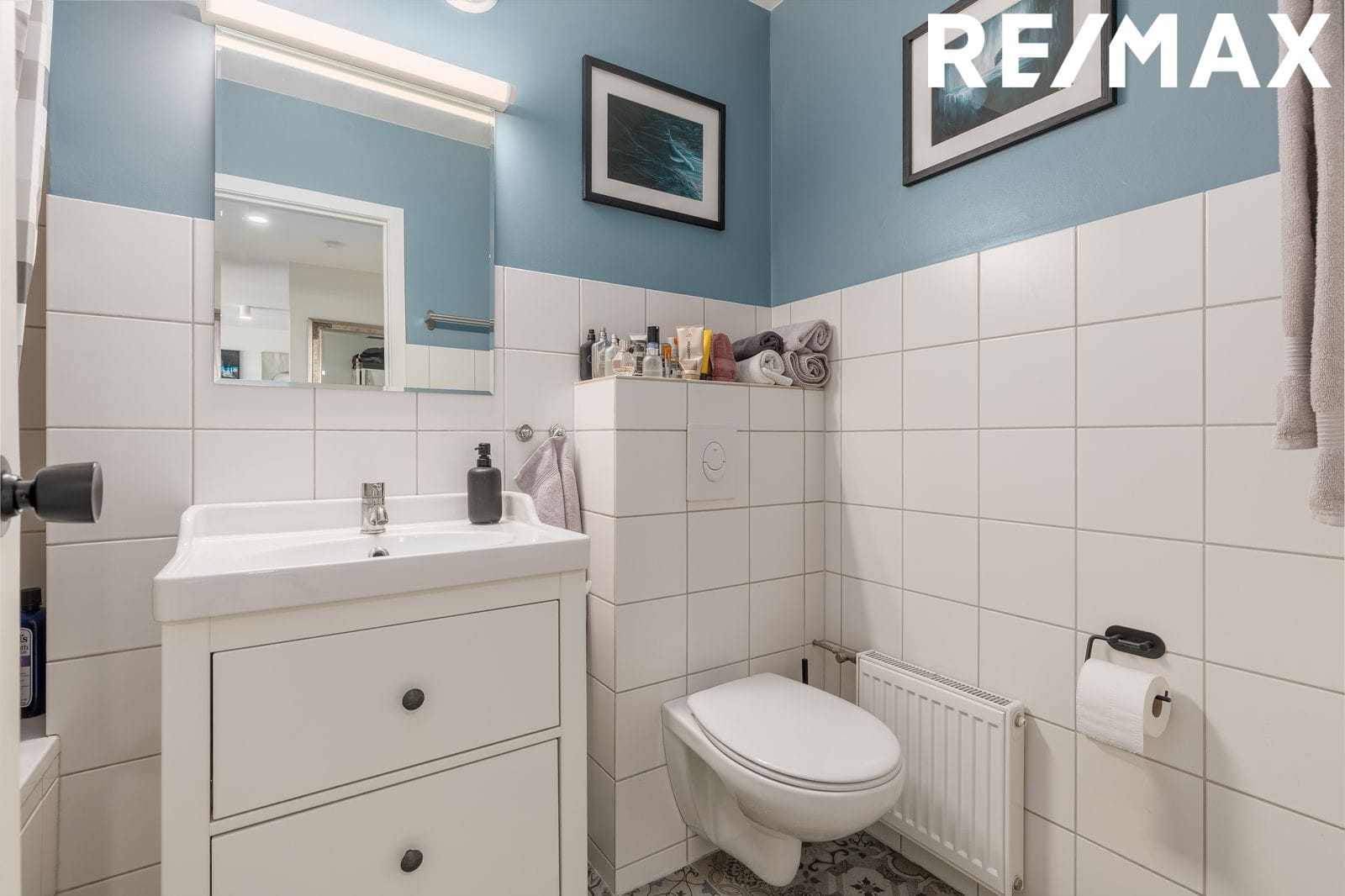 Baðherbergi: nýlega endurnýjað, baðkar með sturtu, innrétting og upphengt salerni. Flísar á gólfi og veggjum.
