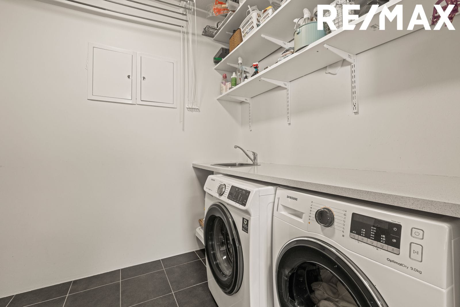 Þvottahús: Flísar á gólfi. Tengi fyrir þvottavél og þurrkara. Vinnuborð með vaski. Hillur á vegg.