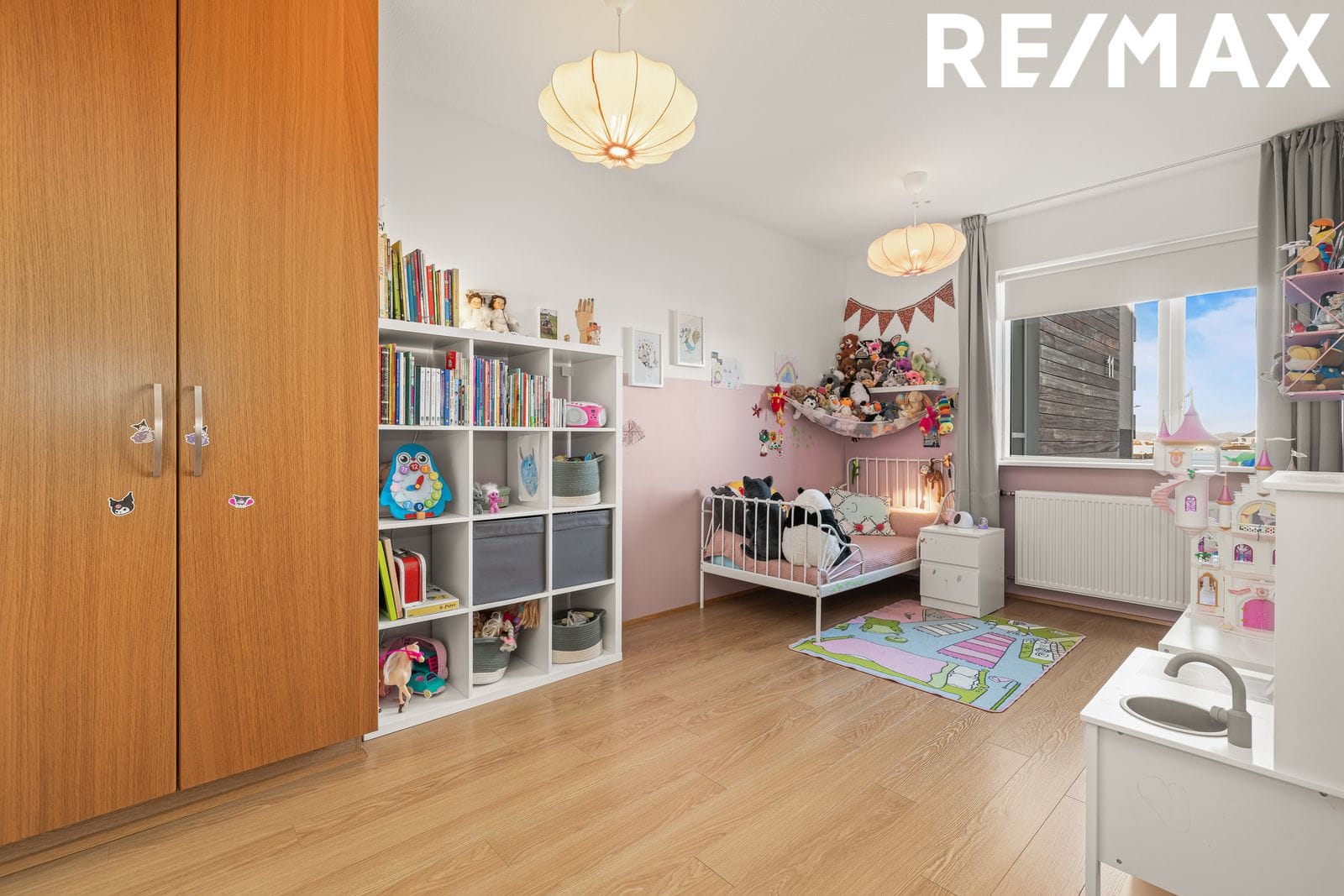 Barnaherbergi 2: Rúmgott herbergi með parket á gólfi og fataskáp.