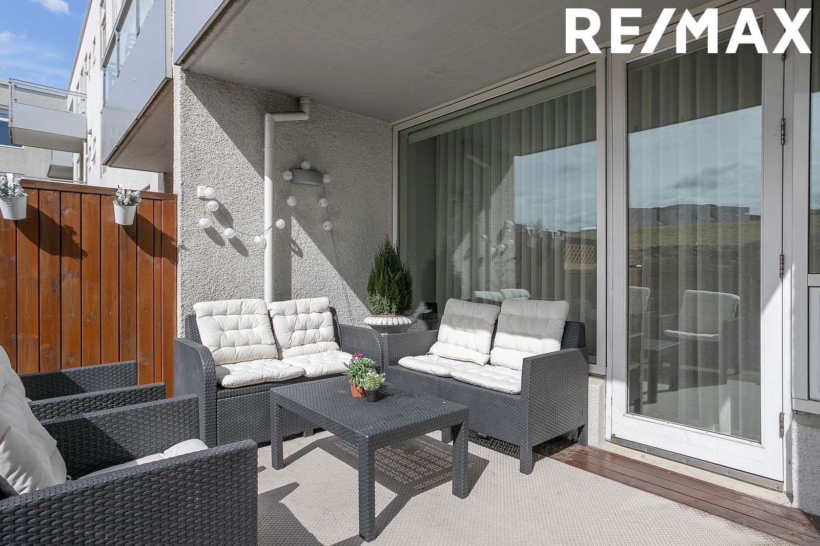 Björt og vel skipulögð 112,5 fm. fjögurra herbergja íbúð á fyrstu hæð með sér þvottahús, skjólsæla verönd með skjólveggjum og sér bílastæði í lokaðri bílageymslu með hleðslustöð fyrir rafmagnsbíla.
