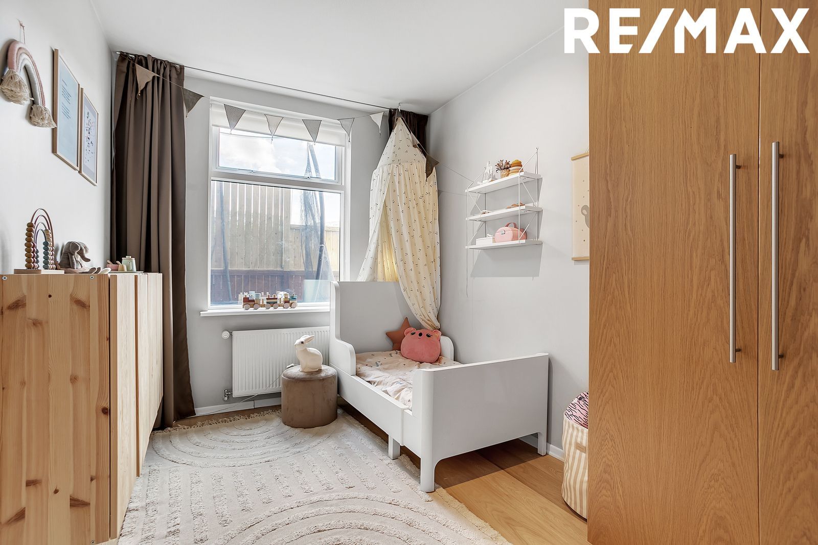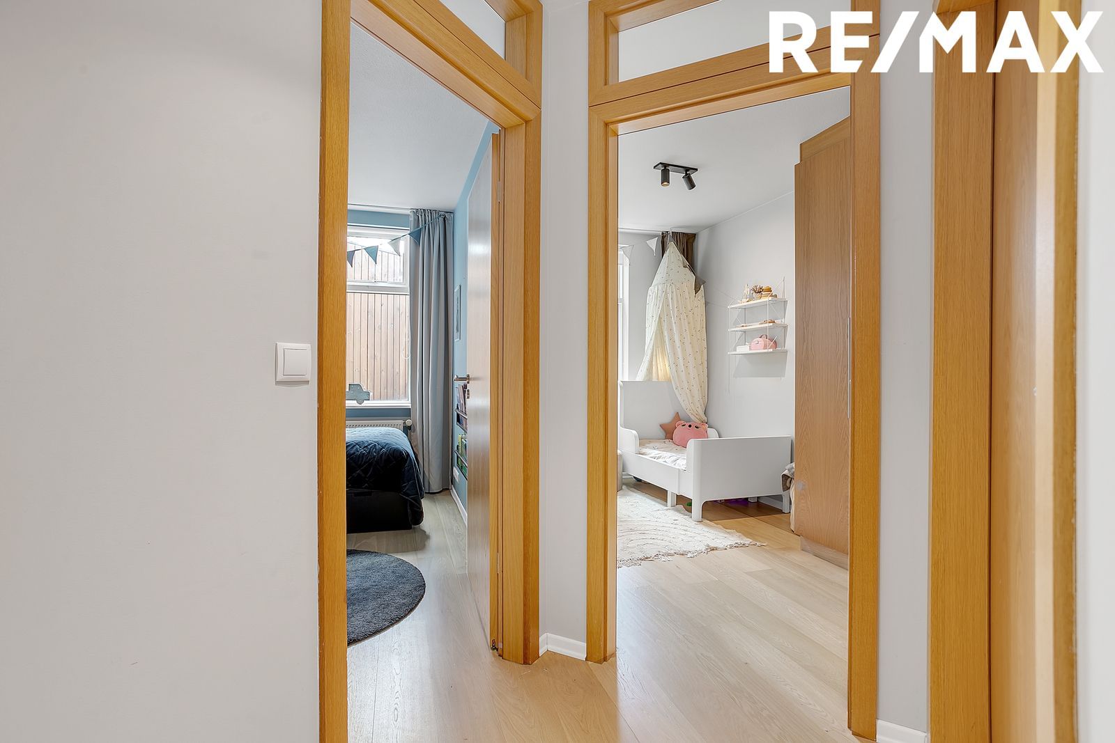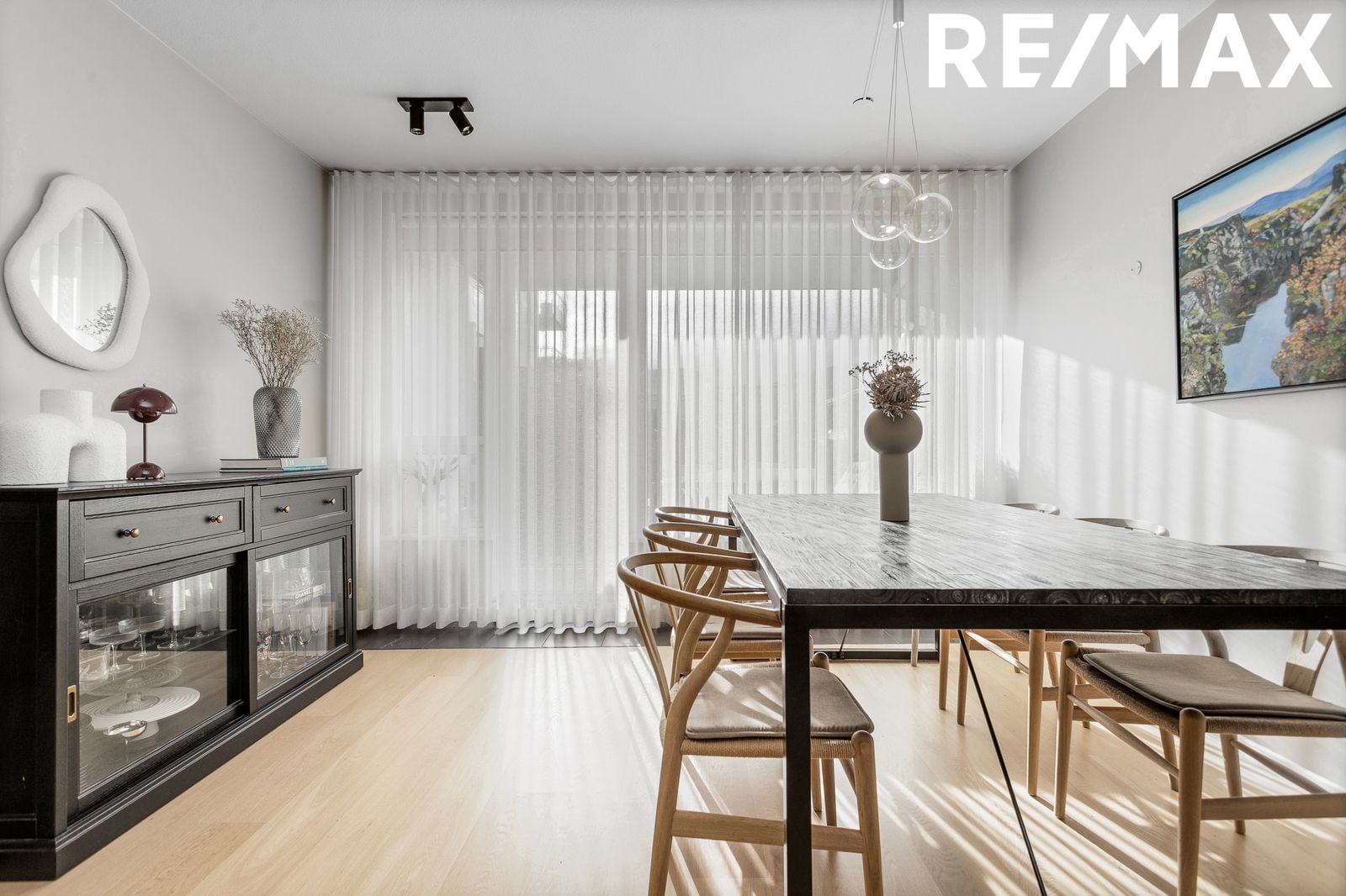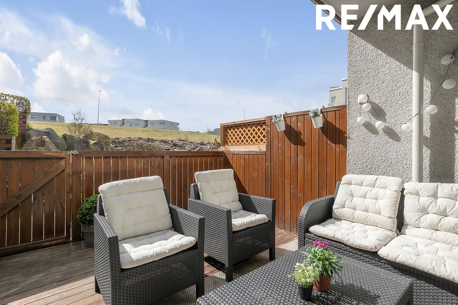 Nánari lýsing: Forstofuhol/ gangur er með innbyggðum fataskápum og parket á gólfi. Hjónaherbergið er rúmgott með fataskáp og parket á gólfi. Opið, bjart og rúmgott alrými sem telur stofu, borðstofu og eldhús með borðkrók. Innrétting í eldhúsi er á tveimur veggjum með gott vinnu, skúffu og skápapláss. Bökunarofn er í vinnuhæð, innbyggður ísskápur með frystir og innbyggð uppþvottavél. Parket á gólfi. Stofan og borðstofan fær mikla birtu inn frá gólfsíðum gluggum inn í eldhúsi og gólfsíðum gluggum frá borðstofunni. Útgengi er út frá borðstofu út á skjólasæla suður-verönd með skjólveggjum. Baðherbergi er með flísum á gólfi og á veggjum. Upphengt salerni, baðkar með sturtu aðstöðu og hvít innrétting með handlaug og gott skúffupláss, hringlaga spegill þar fyrir ofan með lýsingu í og handklæðaskáp þar við hlið. Sér þvottahús er með flísum á gólfi ásamt tengi og aðstöðu fyrir þvottavél og þurrkara til að hafa í vinnuhæð og skolvask þar við hlið. Barnaherbergin eru tvö, bæði rúmgóð með parket á gólfi og fataskápum.