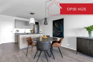 Eldhús er í alrými með stofu og borðstofu. Falleg innrétting og góð tæki auk þess er eldhúseyja með helluborði og háfi yfir. Ísskápur og uppþvottavél geta fylgt með.