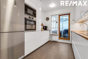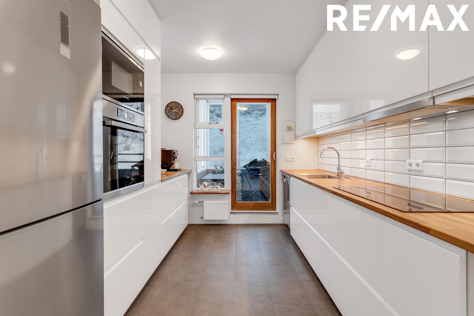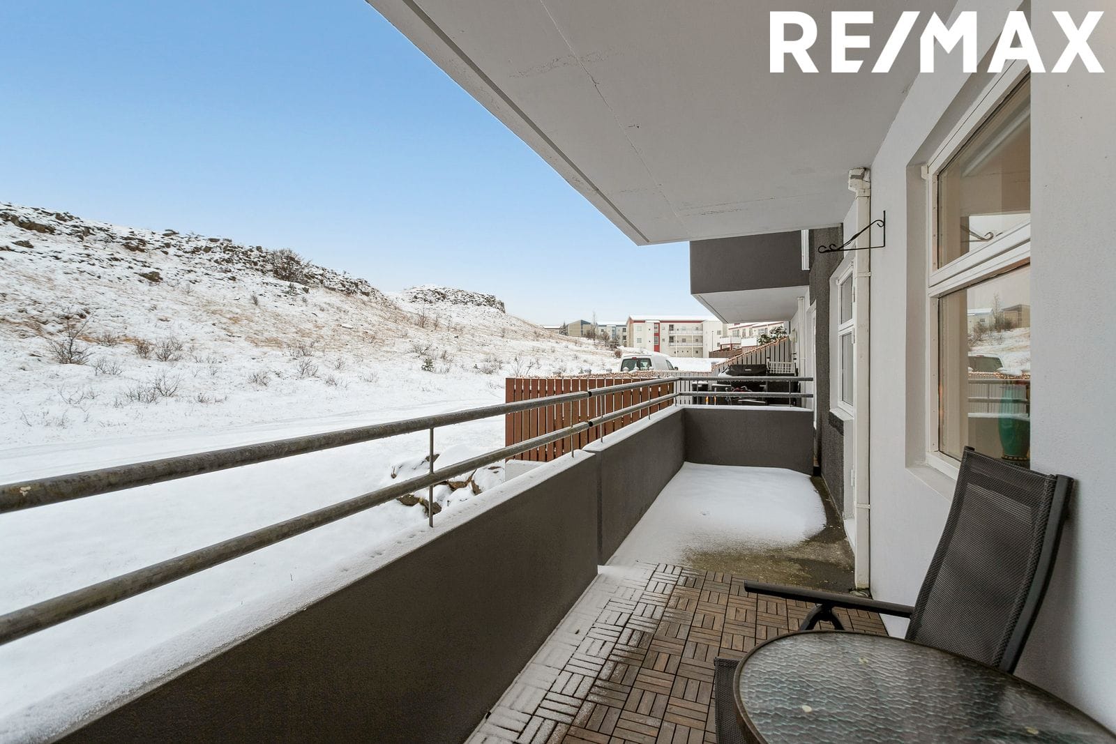 Eldhús er nýlega endurnýjað með fallegum hvítum innréttingum, flísar eru á milli skápa. Spanhelluborð með viftu, bökunarofn og örbylgjuofn í vinnuhæð, vínyl-flísar á gólfi. Úr eldhúsi er útgengt út á rúmgóðar 13,4 fm.