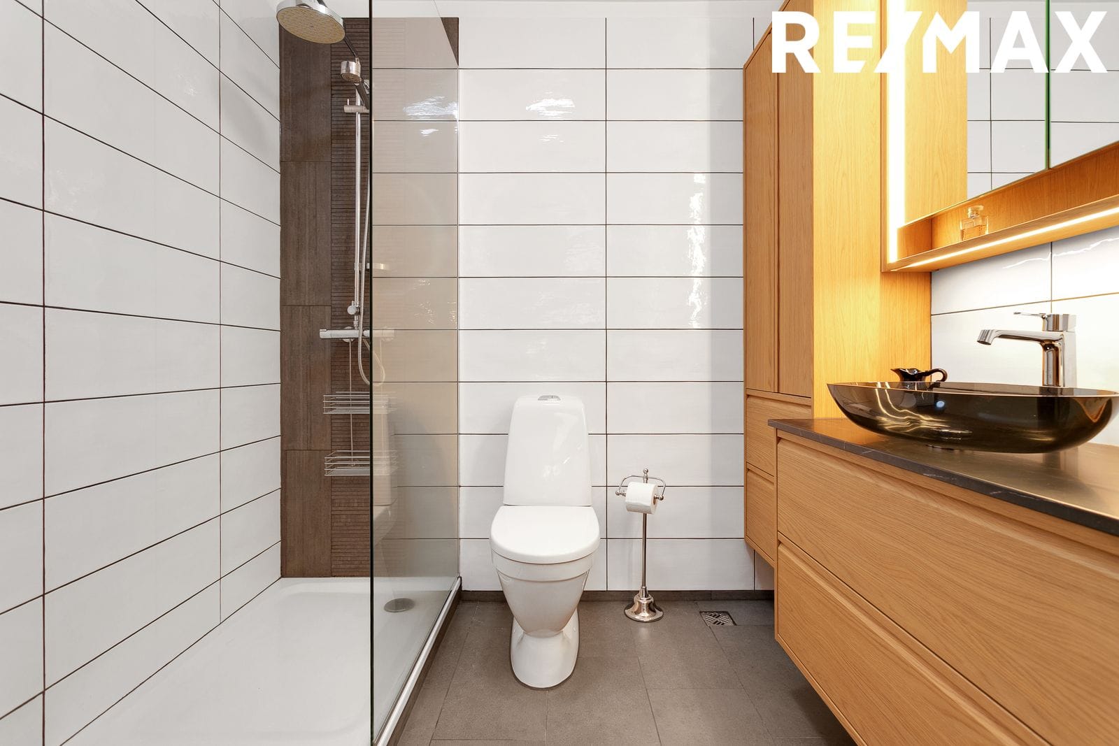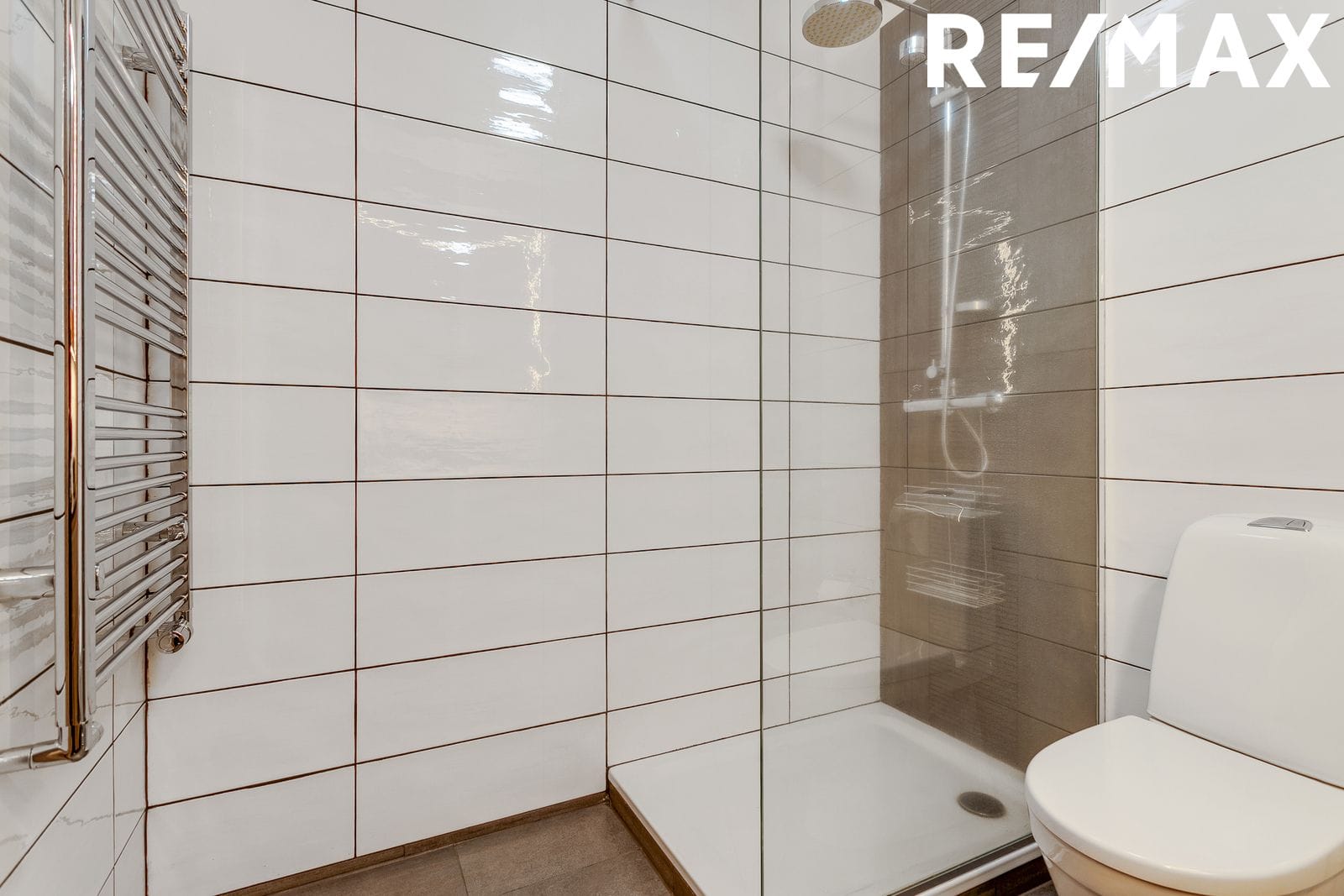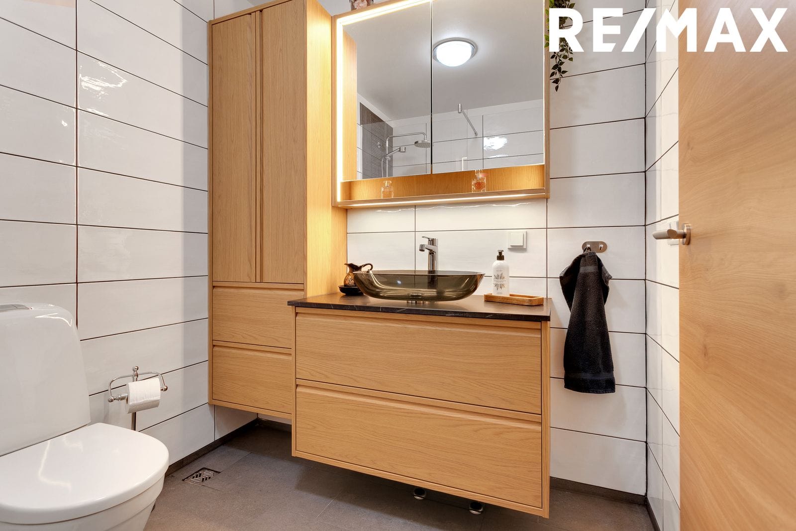 Baðherbergi er nýlega tekið í gegn, með fallegum og stílhreinum innréttingum, góðu skápaplássi og speglaskáp með lýsingu. Sturta með glerþili og handklæðaofn. Gólf er flísalagt og veggir að mestu.