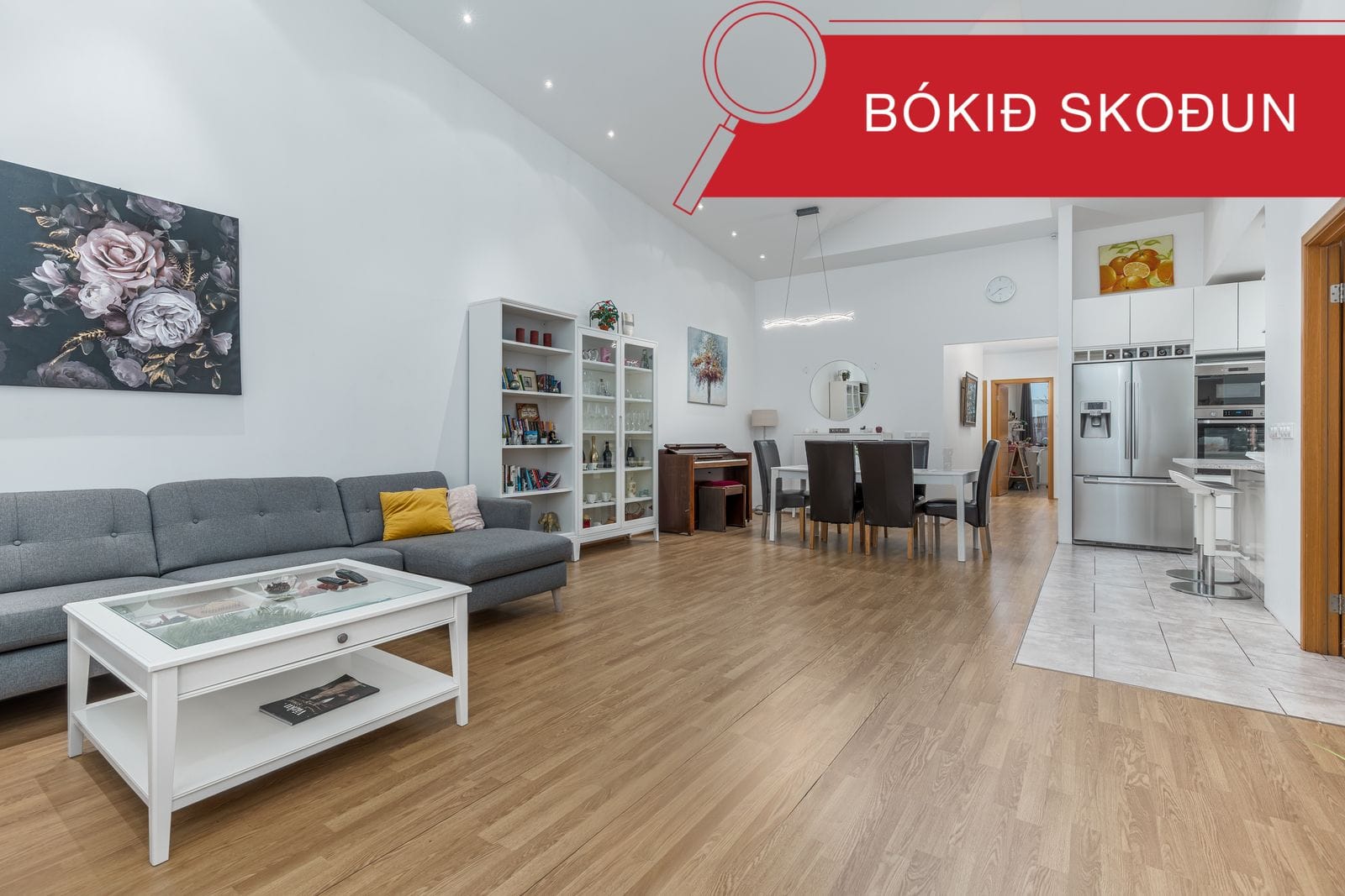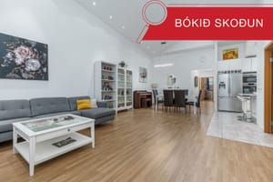 Stofa og eldhús liggja saman í rúmgóðu björtu rými með góðri lofthæð.