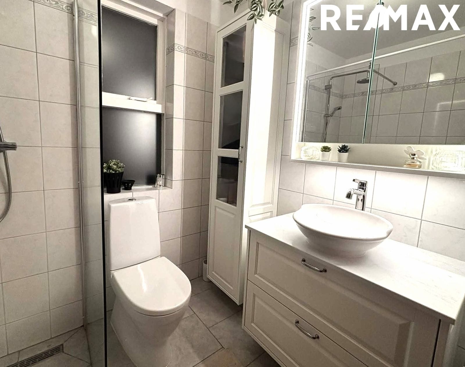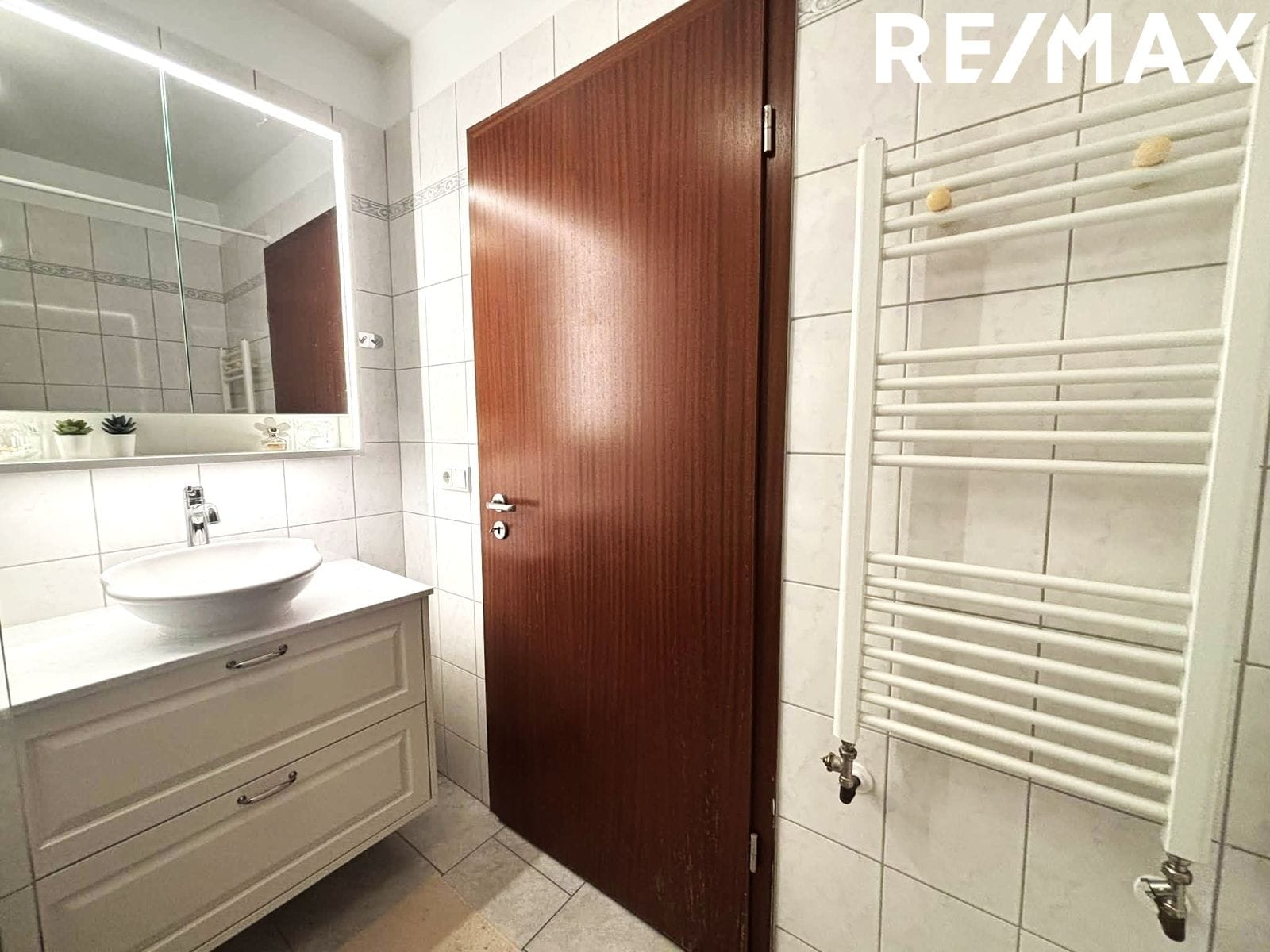 Baðherbergi er flísalagt í hólf og gólf. Nýleg (2024) hvít innrétting, ílangur veggfestur skápur og speglaskápur með borði. Einnig er vaskur á ljósri borðplötu nýr sem og blöndunartækin og selernið. Hvítur handklæðaofn og walk-in sturtuklefi með gleri.