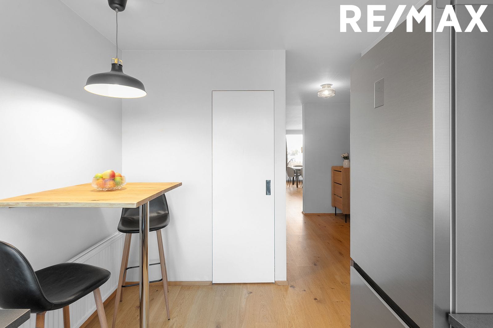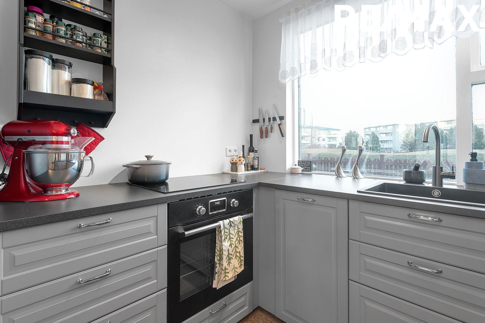 Eldhús var gert upp 2022. Grá "U" laga innrétting frá Ikea. Efri skápar með glerhurðum. Tæki voru einnig endurnýjuð, sjálfhreinsandi bakaraofn, spanhelluborð, blöndunartæki og innbyggð uppþvottavél. Á gólfi er parket. Gluggi snýr út í opið grænt svæði til norðurs.