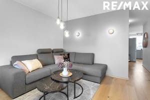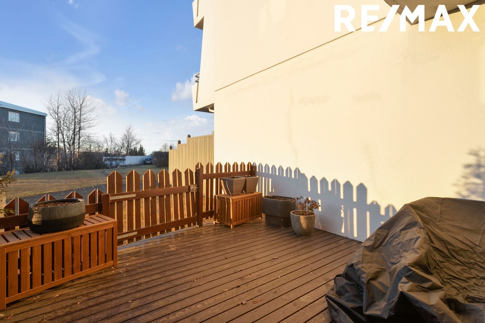Stofa er björt og rúmgóð með útgengi út á afgirta viðarverönd til suðvesturs.