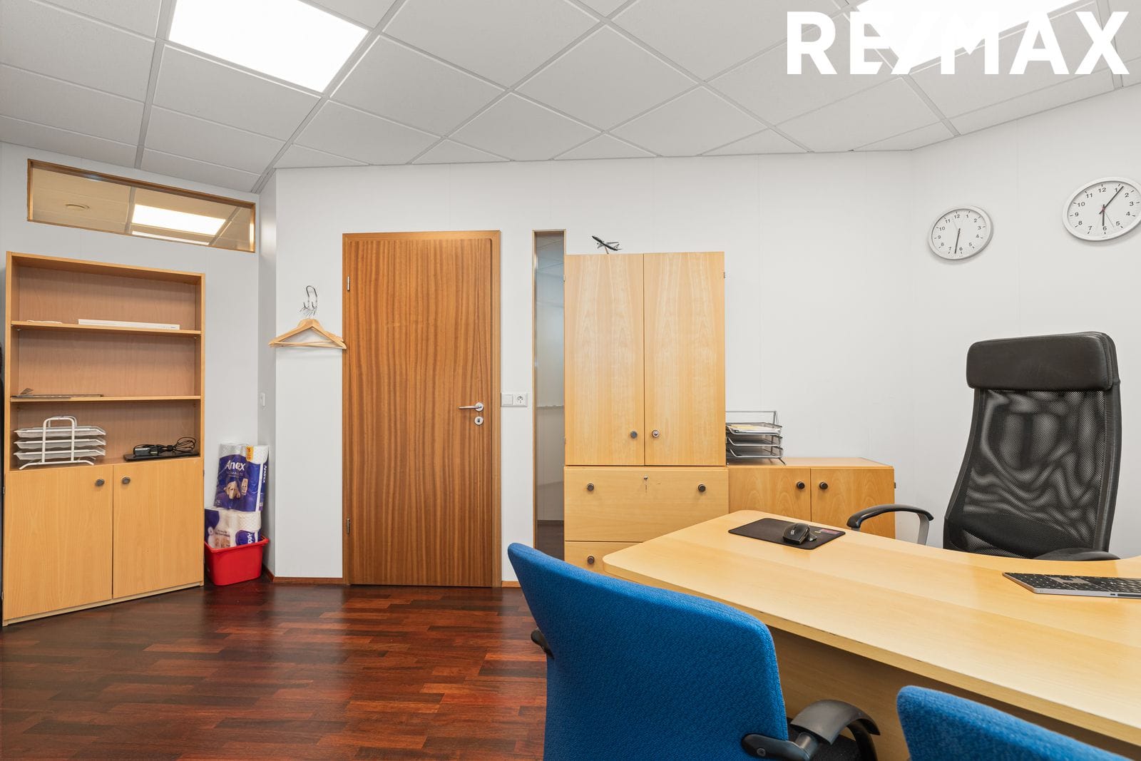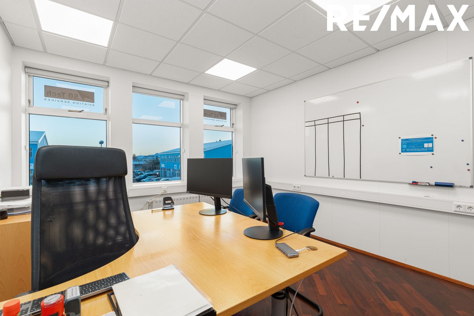 Skrifstofuherbergin eru fjögur. Vísa tvö þeirra út á bílaplan til austurs og tvö þeirra eru á gafli húss til suðurs. Öll með gluggum og opnanlegum fögum. Léttir veggir eru milli herbergja.