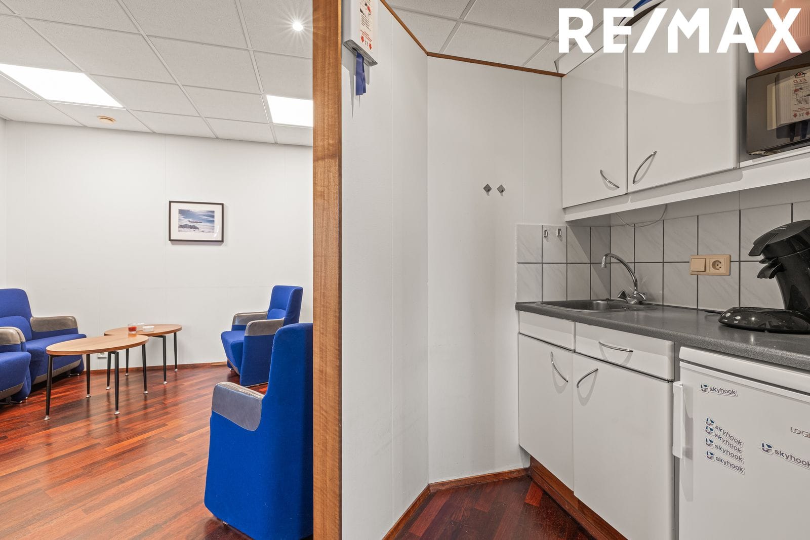Kaffiaðstaða er afmörkuð frammi með léttum vegg. Hvít innrétting með vaski og plássi fyrir lítinn ísskáp. Milli efri og neðri skápa eru veggflísar.