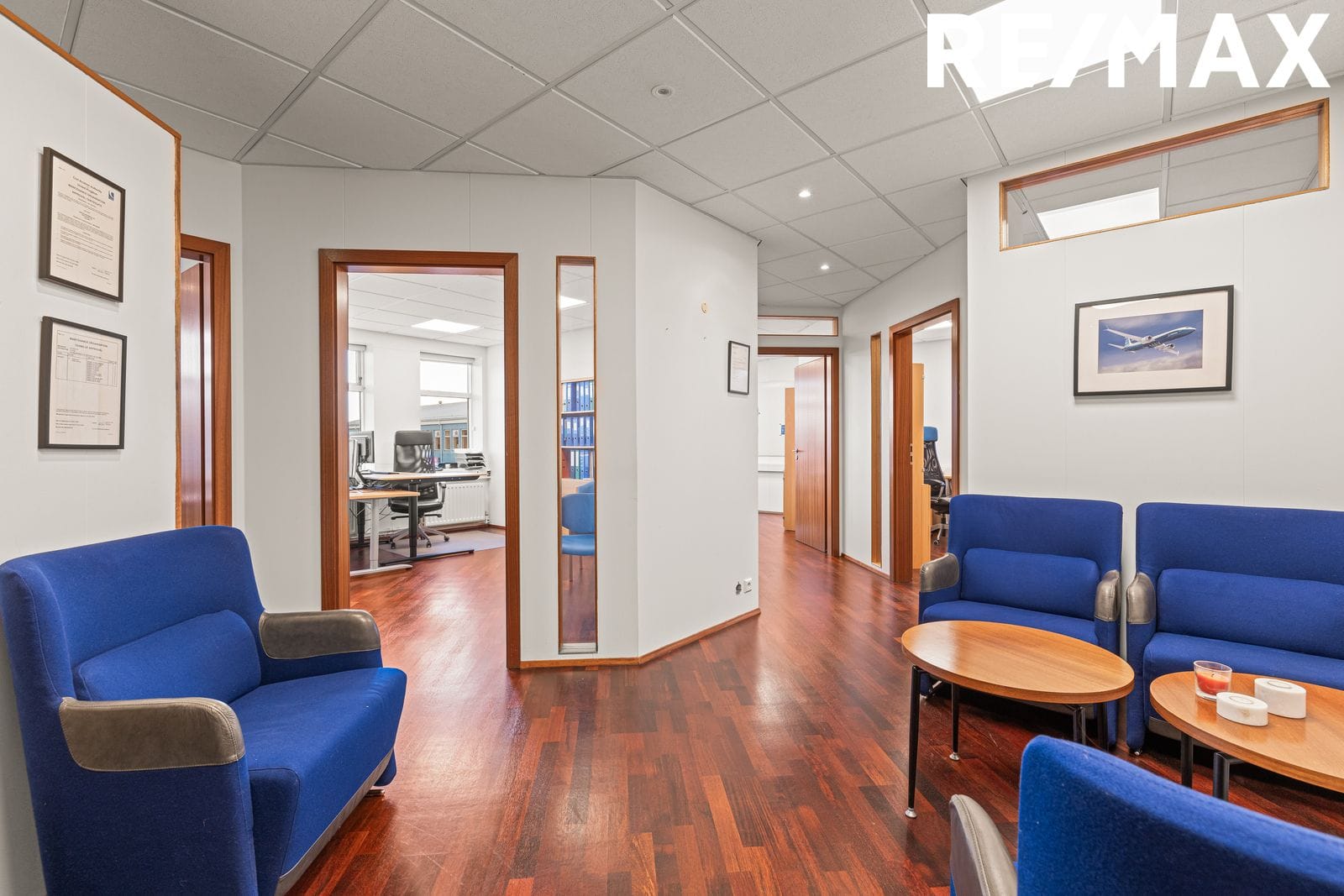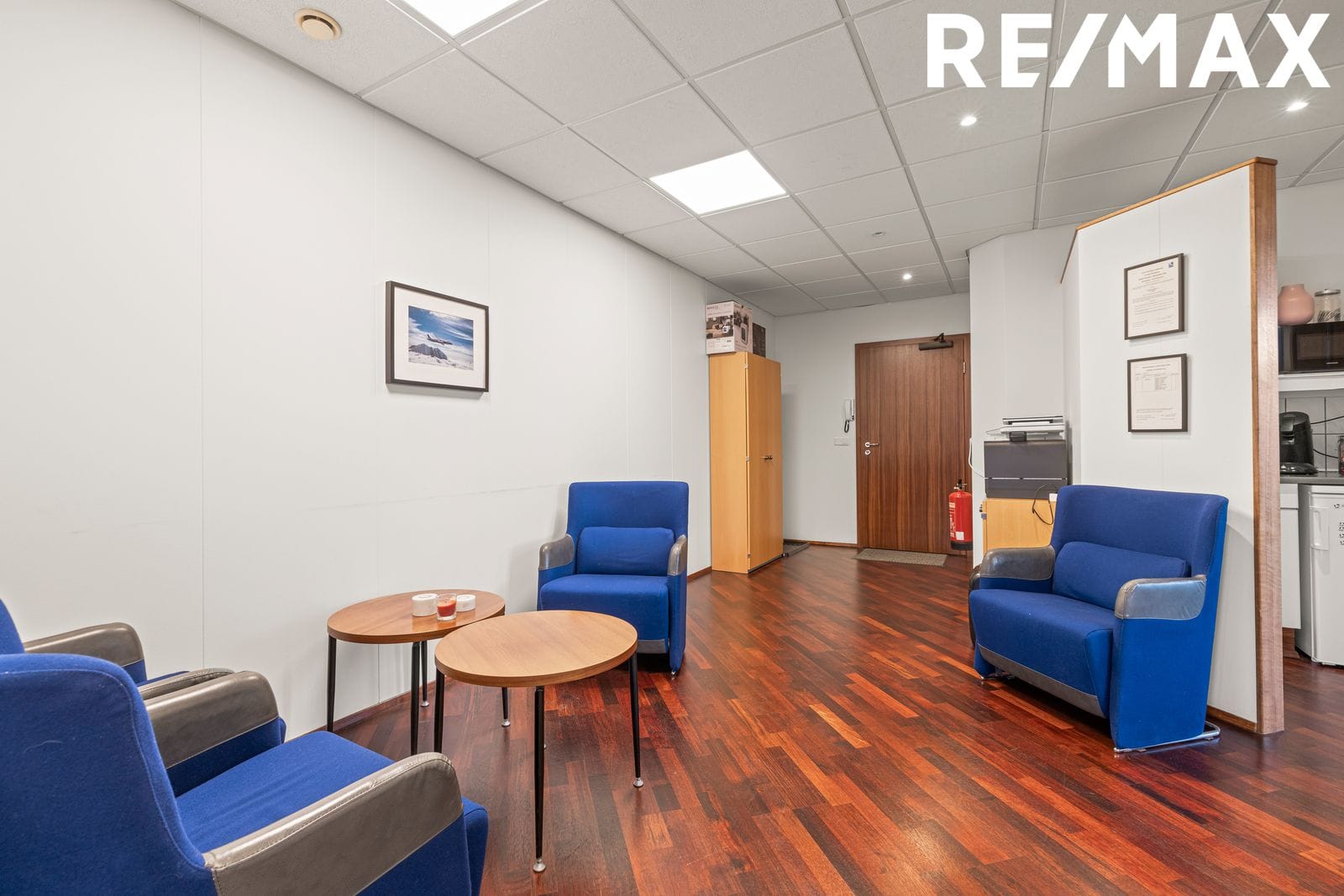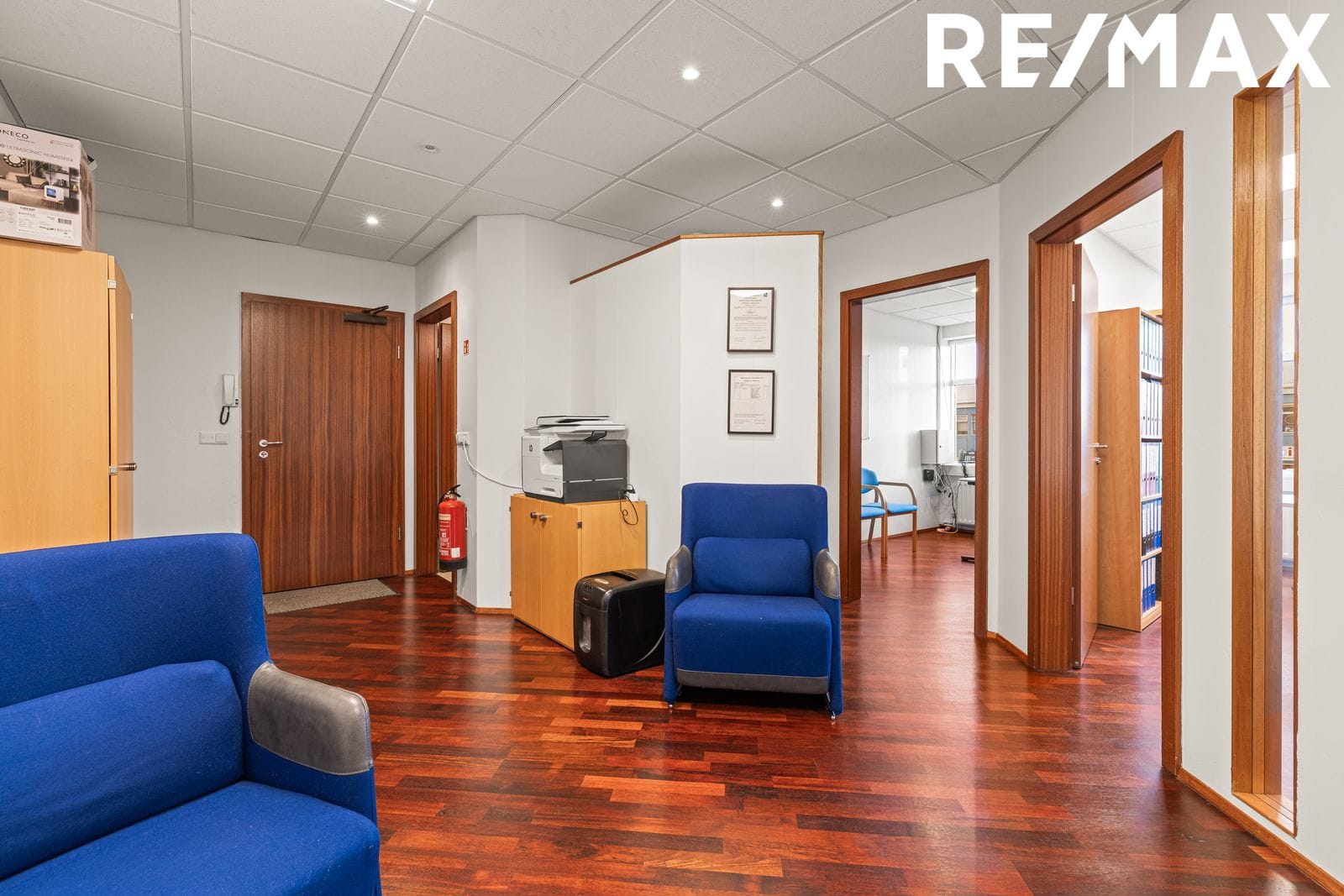 Setustofa er framan við skrifstofuherbergin. Hvítar loftaplötur með innfelldri lýsingu.
