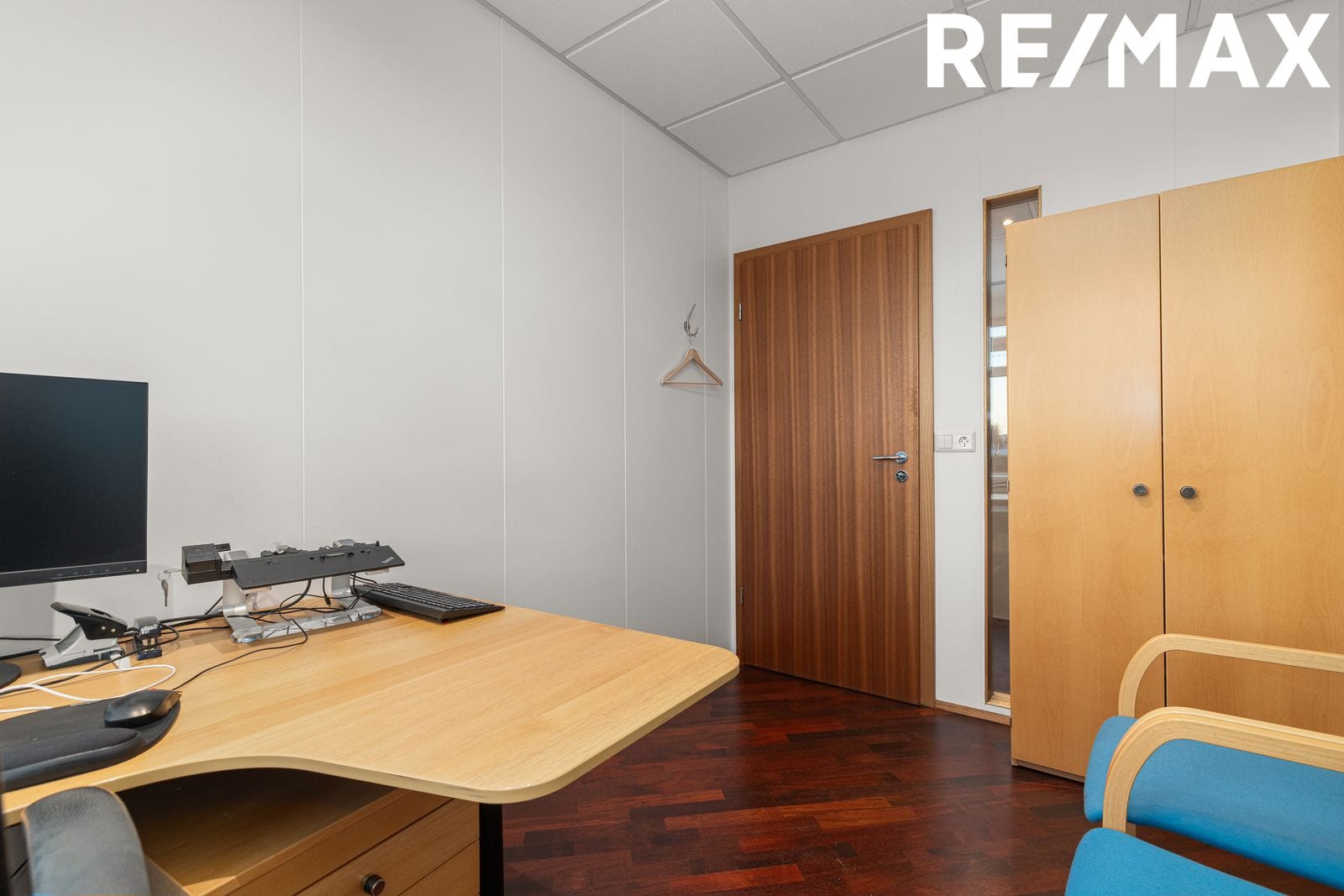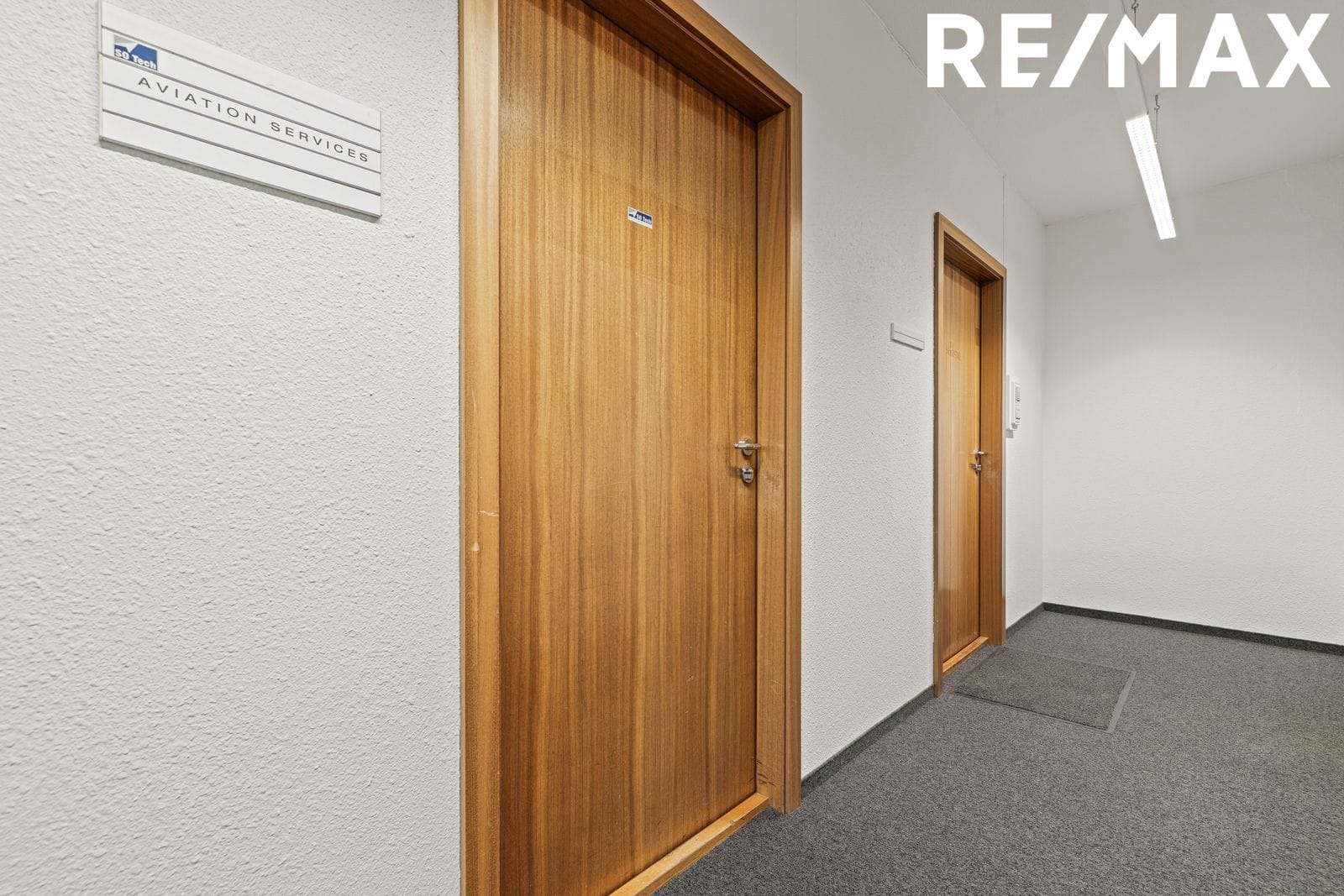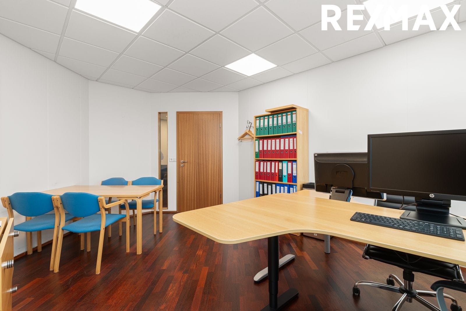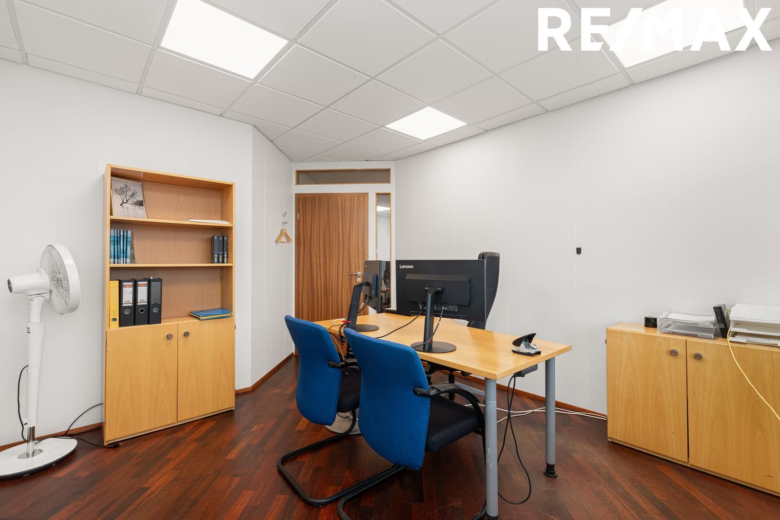Setustofa er framan við skrifstofuherbergin. Hvítar loftaplötur með innfelldri lýsingu.