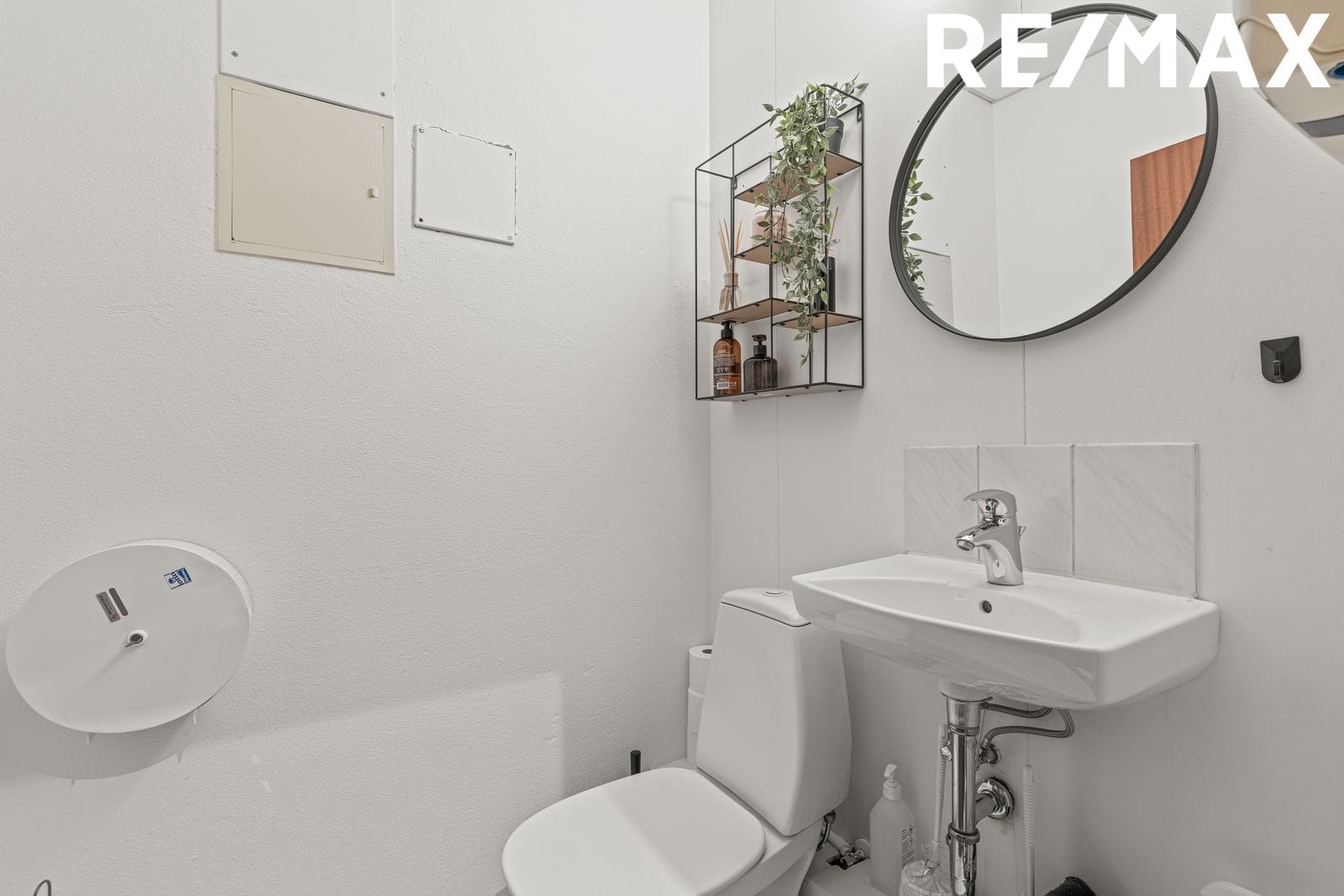 Salerni er á vinstri hönd þegar komið er inn í skrifstofuholið. Salerni og handlaug. Rafmagnstafla er þar á vegg. Ljósar gólfflísar.