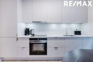 Innréttingar og skápar eru íslensk smíði frá AXIS. Borðplata í eldhúsi er ljós Quartz-steinn frá Granítsmiðjunni og er vaskur í eldhúsi undirlímdur. Eldhústæki eru vönduð frá BOSCH og AEG. Innbyggður ísskápur, Spanhelluborð og bakaraofn. Gólfhitakerfi með Danfoss stýribúnaði.