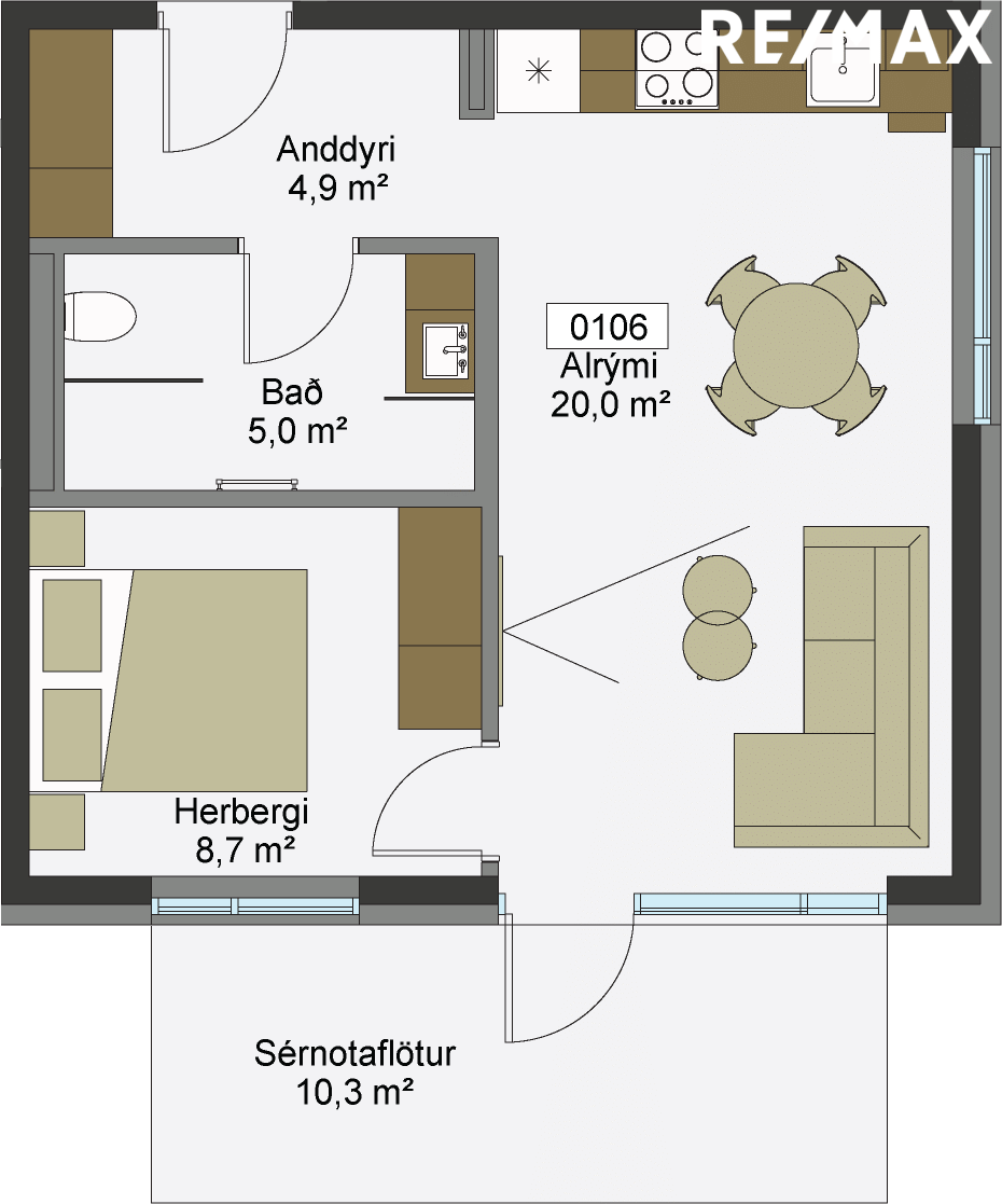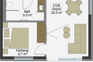 Íbúð 106 er tveggja herbergja íbúð á fyrstu hæð með 10,3 m2 sérafnotareit. Birt stærð eignar eru alls 52,8 m2 og þar af er sér geymsla í sameign 5,5 m2 merkt (-019) og því birt flatarmál íbúðar 47,3 m2.