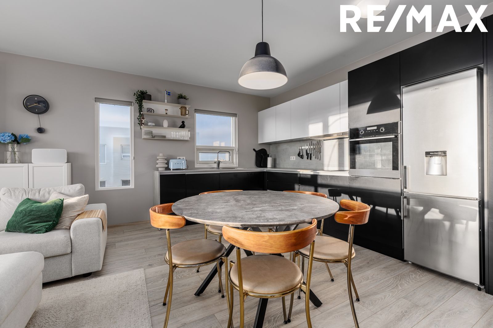 Nánari lýsing eignar: Forstofa: Flísar á gólfi með fataskáp. Stofa/Borðstofa: Rúmgóð og björt. Parket á gólfi. Útgengt út á stórar suðursvalir. Eldhús: Rúmgóð innrétting í L með miklu skápaplássi. Parket á gólfi. Baðherbergi: Flísalagt í hólf og gólf með fallegri innréttingu, sturtuklefi og innréttingu fyrir þvottavél og þurrkara. Hjónaherbergi: Mjög rúmgott með parket á gólfi og fataskáp. Herbergi 1: Parket á gólfi og með fataskáp. Herbergi 2: Parket á gólfi og með fataskáp. Geymsla/Herbergi: Parket á gólfi og með glugga, væri hægt að setja 4 herbergið þar. Hjóla og vagnageymsla í sameign.