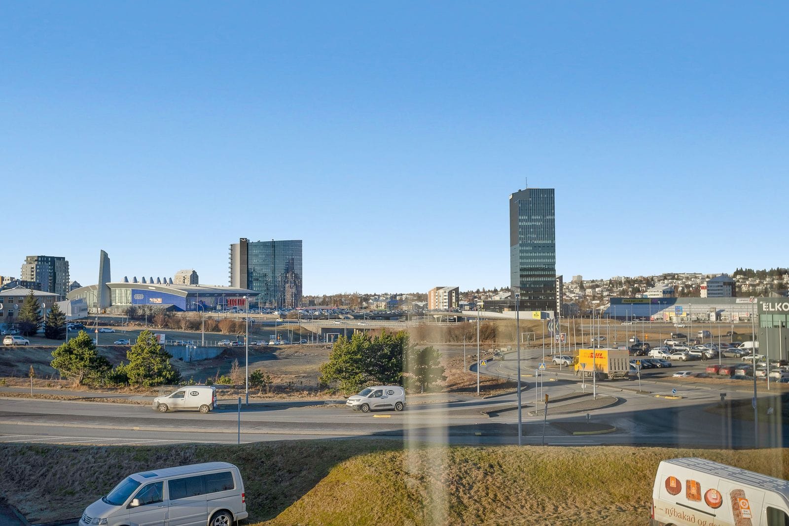 Stofa og borðstofaBjart og rúmgott alrými með parketi á gólfi. Stór gluggar hleypa inn mikilli dagsbirtu og útgengi er á yfirbyggðar svalir með gott útsýni yfir nágrennið.