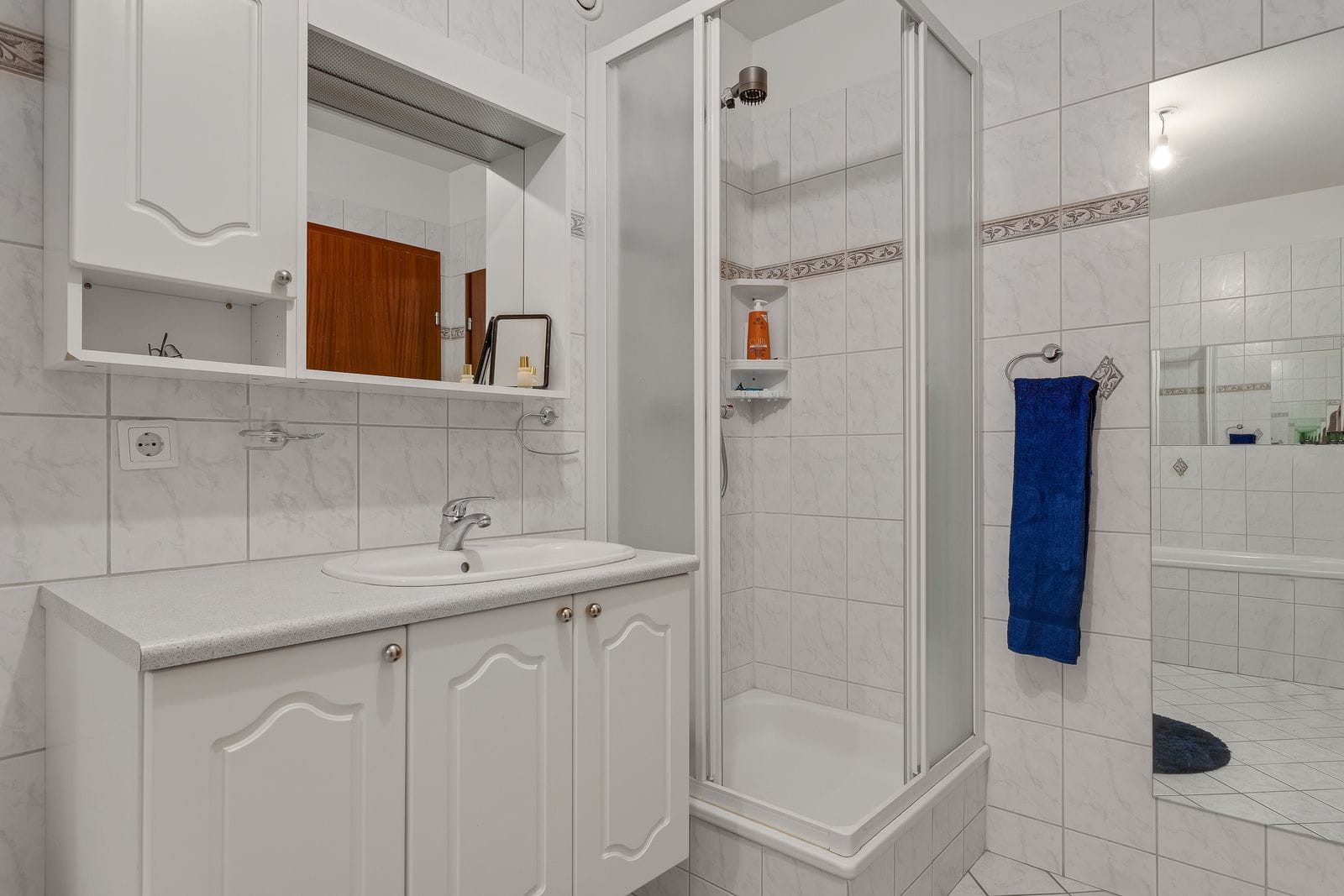 BaðherbergiRúmgott og flísalagt baðherbergi með baðkari og sturtuklefa. Hvít innrétting með vaski og spegli.