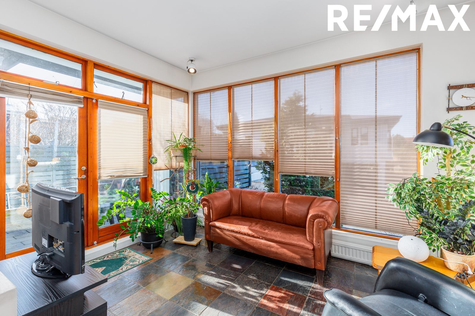 Stofa: Parket á gólfi á efri stofu en flísar á hluta stofu sem er neðar. Úr neðri stofu er útgengt á framlóð hússins.