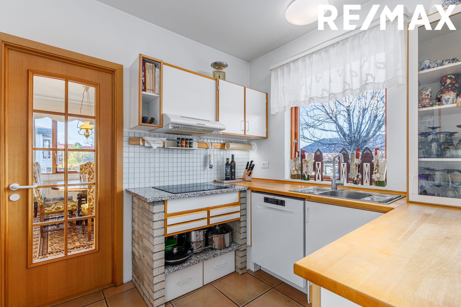 Eldhús: Flísar á gólfi. Hvít innrétting með góðu skápaplássi. Helluborð með háfi yfir. Baksturs og örbylgjuofn frá Siemens.