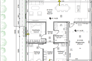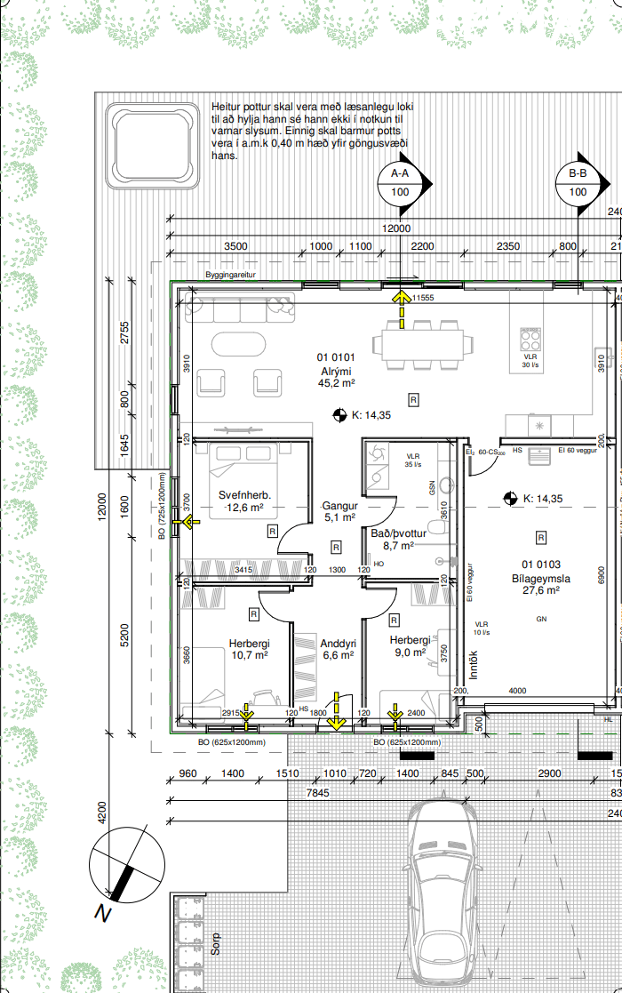 Húsið er byggt úr timbri á steyptri plötu og klætt að utan með lituðu áli. Þak er klætt með aluzink.