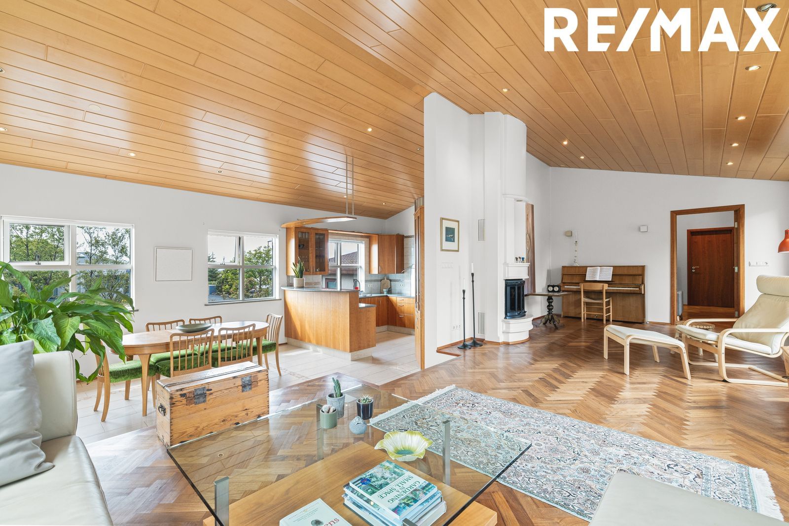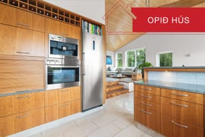 Eldhús / borðstofa / stofa eru í björtu alrýmiEldhús: Rúmgott og bjart, kirsuberjainnrétting, granítborðplötur, spanhelluborð, háfur, Miele ofn í vinnuhæð, Miele innbyggð kaffivél, uppþvottavél Electrolux og ísskápur Samsung. Flísar á milli efri og neðri skápa og á gólfi, viðarpanell og innfelld lýsing í lofti, opið í borðstofu og stofu.
