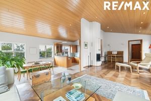 björt stofa, arinn parket á gólfi gengið úr stofu út á verönd, opin