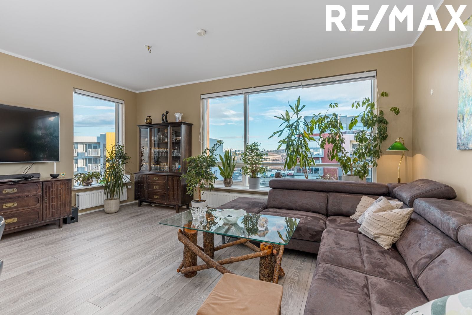 Stofa/borðstofa: Stórt rými þar sem stofa/borðstofa og eldhús eru. Parket á gólfi. Stórir gluggar sem gefa góða birtu í rýmið. Útgengt á stórar svalir sem snúa til austurs.