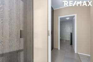 Forstofa: Flísar á gólfi. Góður fataskápur sem nær til lofts. Milli forstofu og baðherbergis er svo rúmgóður geymsluskápur með skolvaski.