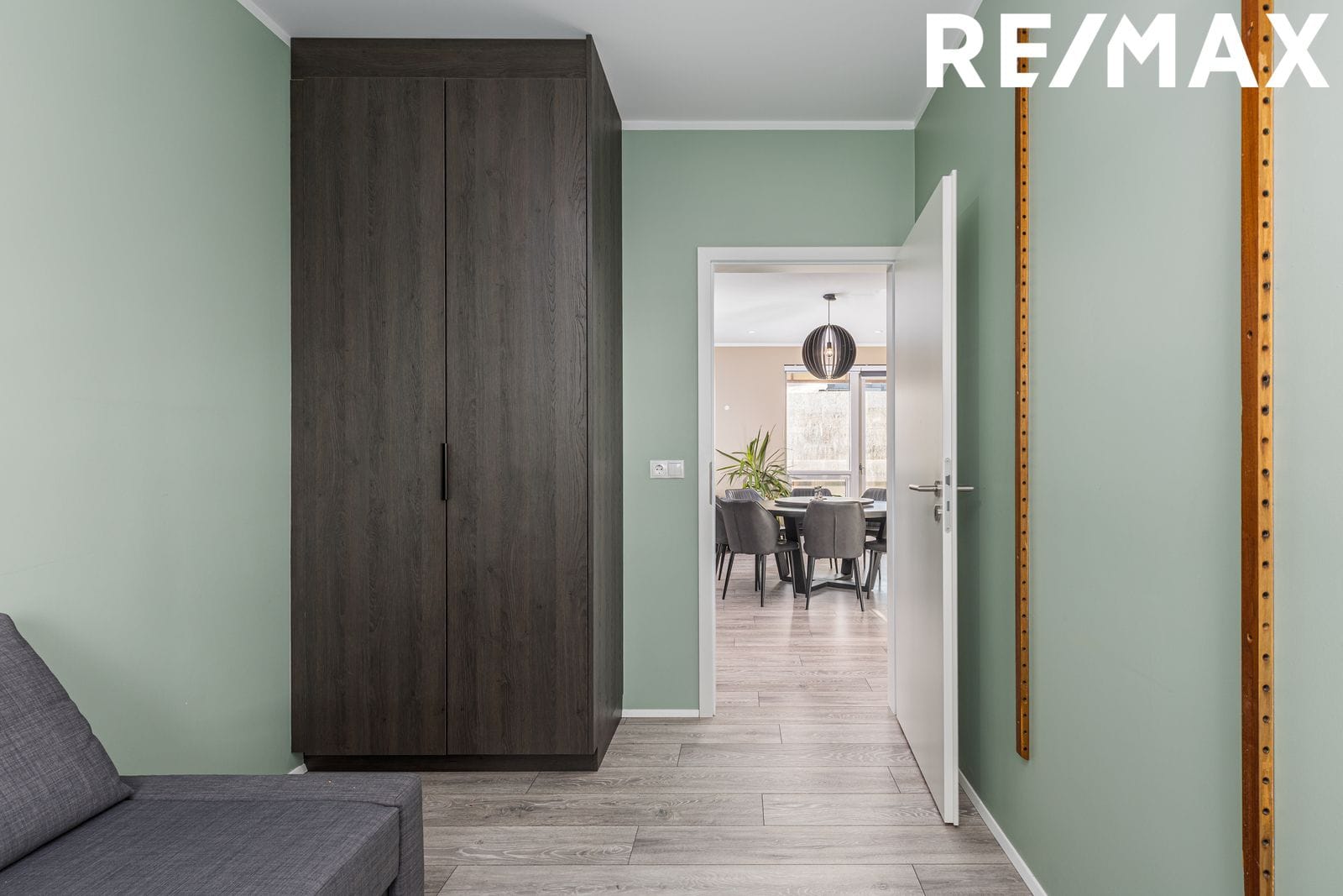 Barnaherbergi: Gott herbergi með parketi á gólfi. Brúnn fataskápur með tveimur einingum. Fallegt útsýni til vesturs.
