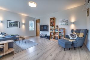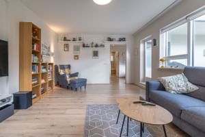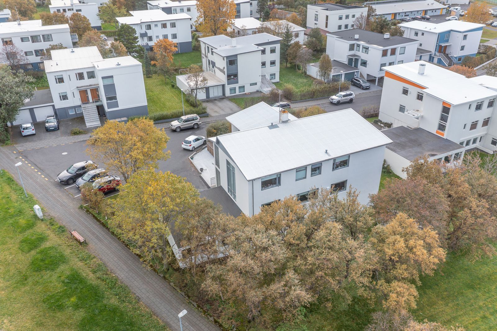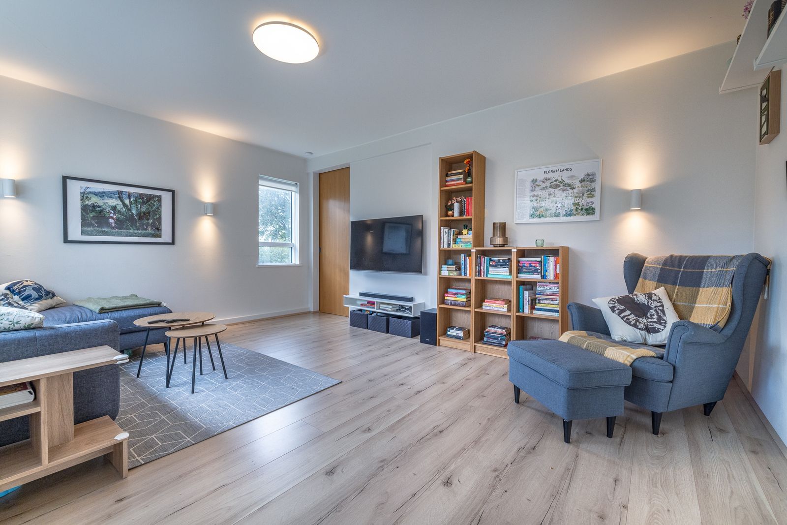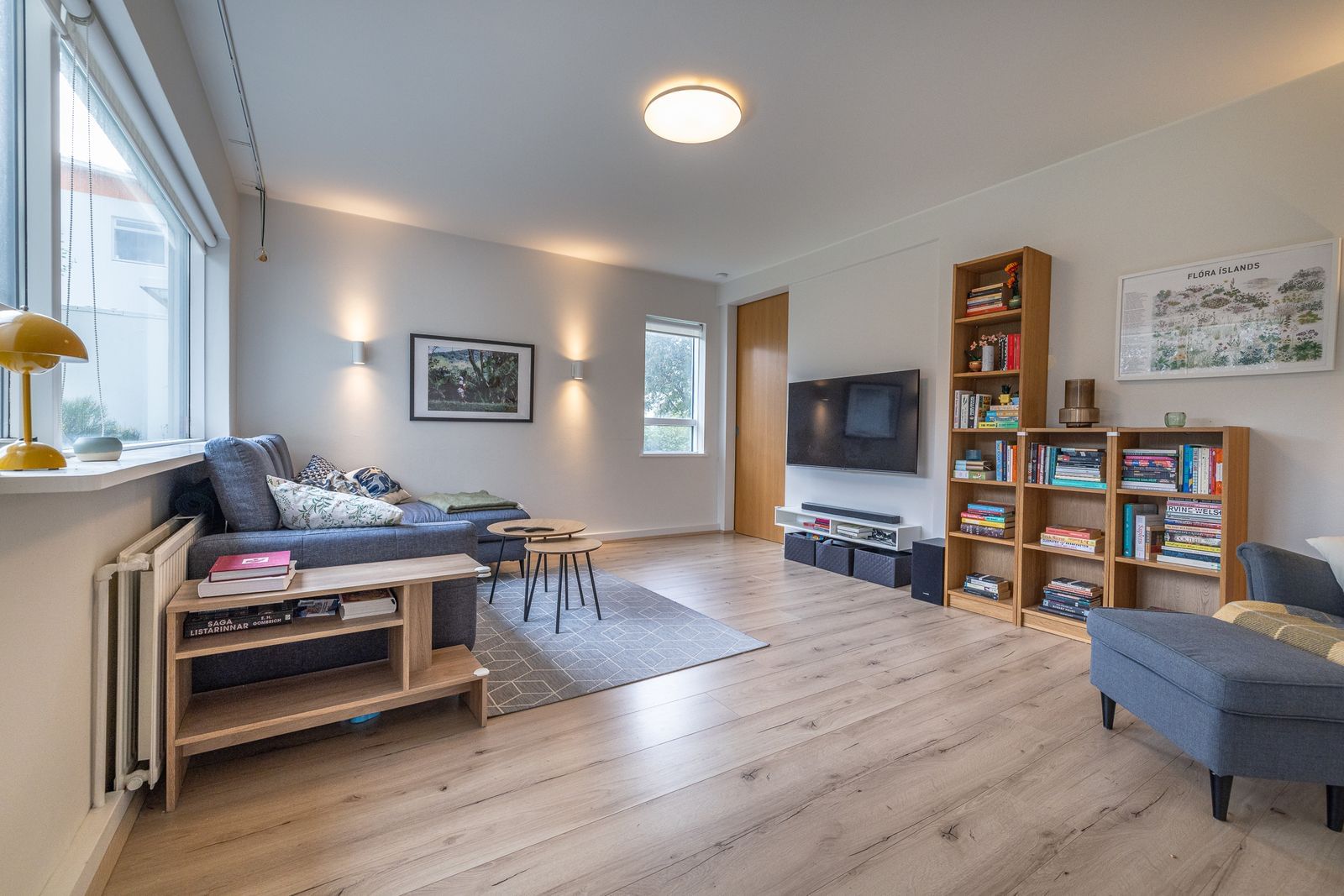 Forstofa: Flísalagt. Eldhús: Harðparket á gólfi, ljós innrétting með eikarborðplötu. Stofa: Harðparket á gólfi, útgengt á sólpall. Baðherbergi: Flísalagt, baðkar með sturtu og handklæðaofn. Hiti í gólfi. Hjónaherbergi: Harðparket á gólfi. Barnaherbergi: Harðparket á gólfi. Geymsla: Flísalagt, innréttað sem fataherbergi. Sólpallur: Snýr í suðvestur. Þvottahús: Í sameign ásamt annarri geymslu.