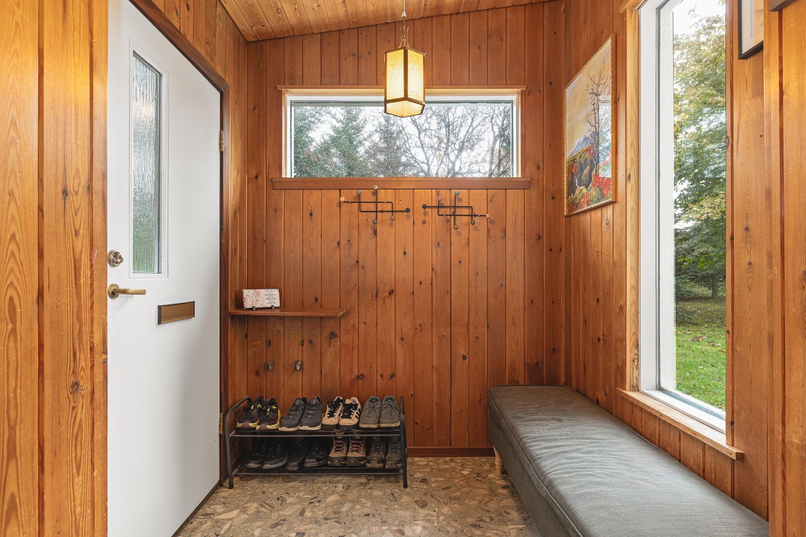 Komið er inn í forstofu með mjög skemmtilegum Terrazzo flísum og stórum glugga sem snýr út í garðinn.