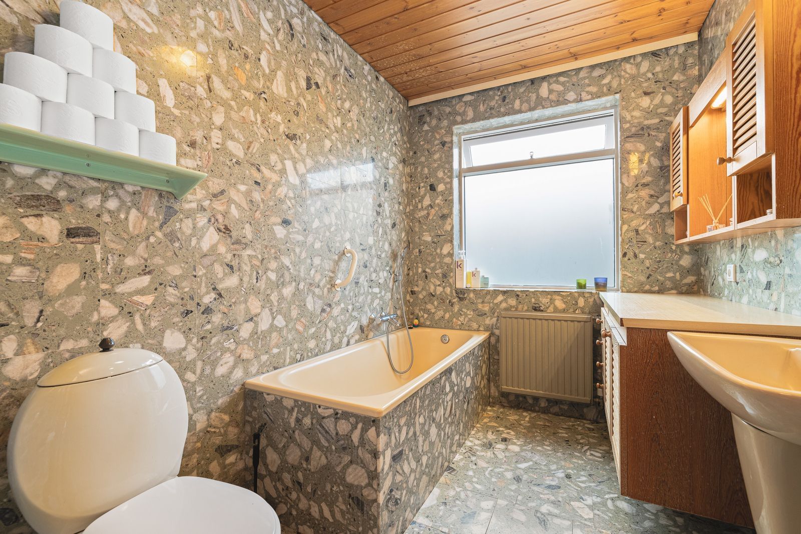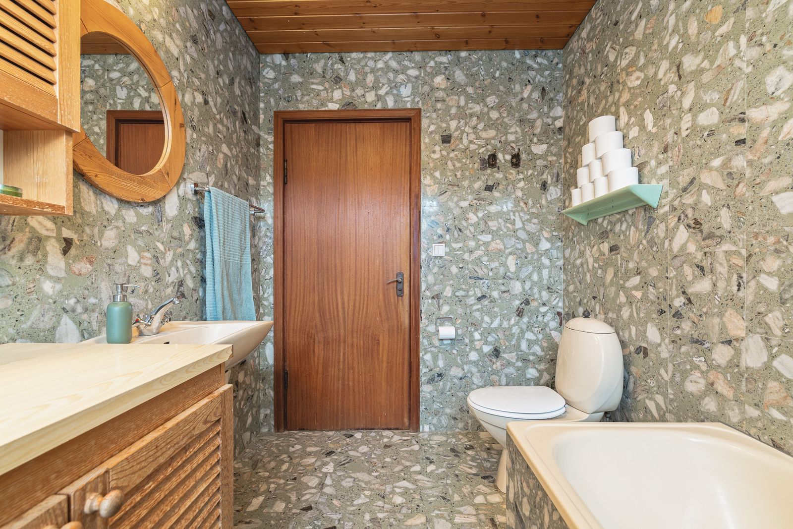 Baðherbergi er með mjög skemmtilegt 80s útlit. Það er flísalagt með sömu fallegu Terrazzo flísum og í forstofunni.