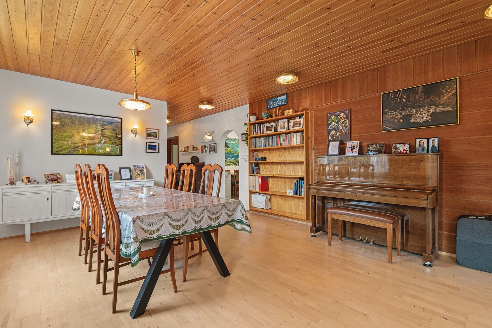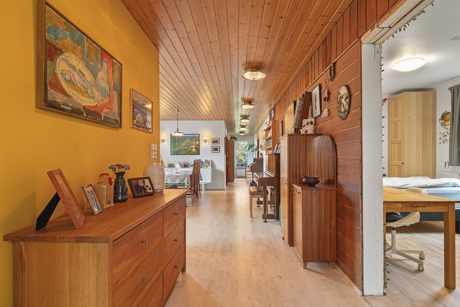 Stofan er með fallegum arni og útgengi út í garð. Samliggjandi er borðstofan. Flísalögð verönd og gróðurhús við húsið.