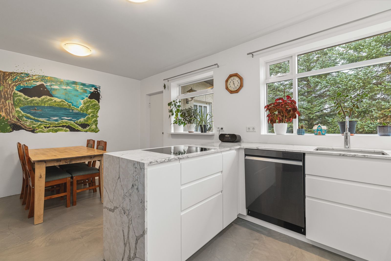 Eldhús var endurnýjað 2023-2024. Gólfið var flotað og lagt microcement yfir. Nýjar vatnslagnir lagðar í eldhús og nýjar raflagnir að hluta. Heimilistækin eru nýleg. Ljós frá Rafkaup og falleg kvars borðplata frá Steinprýði. Niðurfellt helluborð og undirlímdur vaskur.