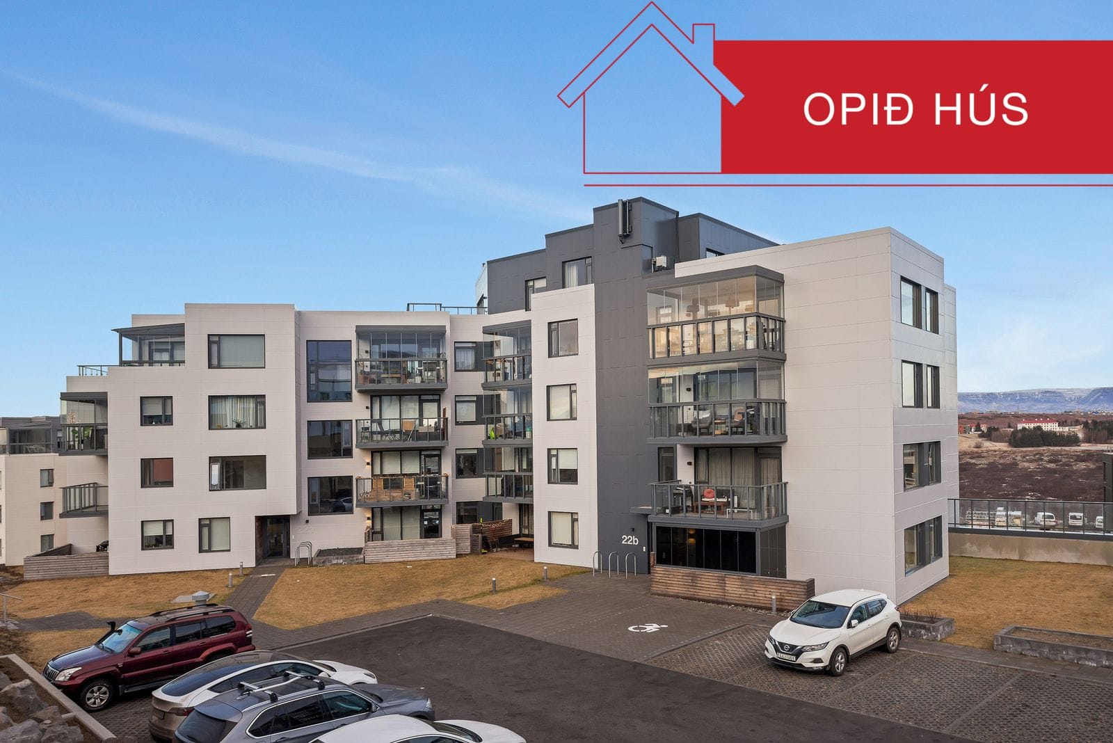 Nánari lýsing: Komið inn í anddyri með parketi á gólfi og innbyggðum forstofuskáp. Eldhús með fallegri hvítri innréttingu með span helluborði og ofni í vinnuhæð. Tengi fyrir uppþvottavél. Útgengi á suðursvalir. Stofa með parketi á gólfi, (útbúið var barnaherbergi á kostnað stofu) Hjónaherbergi með fataskáp og parketi á gólfi. 3 barnaherbergi með parketi á gólfum. Baðherbergi með flísum í hólf og gólf, baðinnrétting og stór sturta sem og upphengt wc sem og handklæðaofn. Sér geymsla í sameign og vagna og hjólageymsla. Sér stæði í bílgeymslu merkt B10.