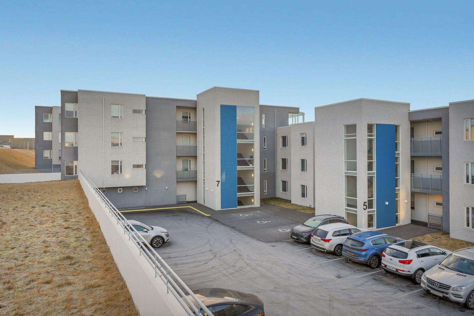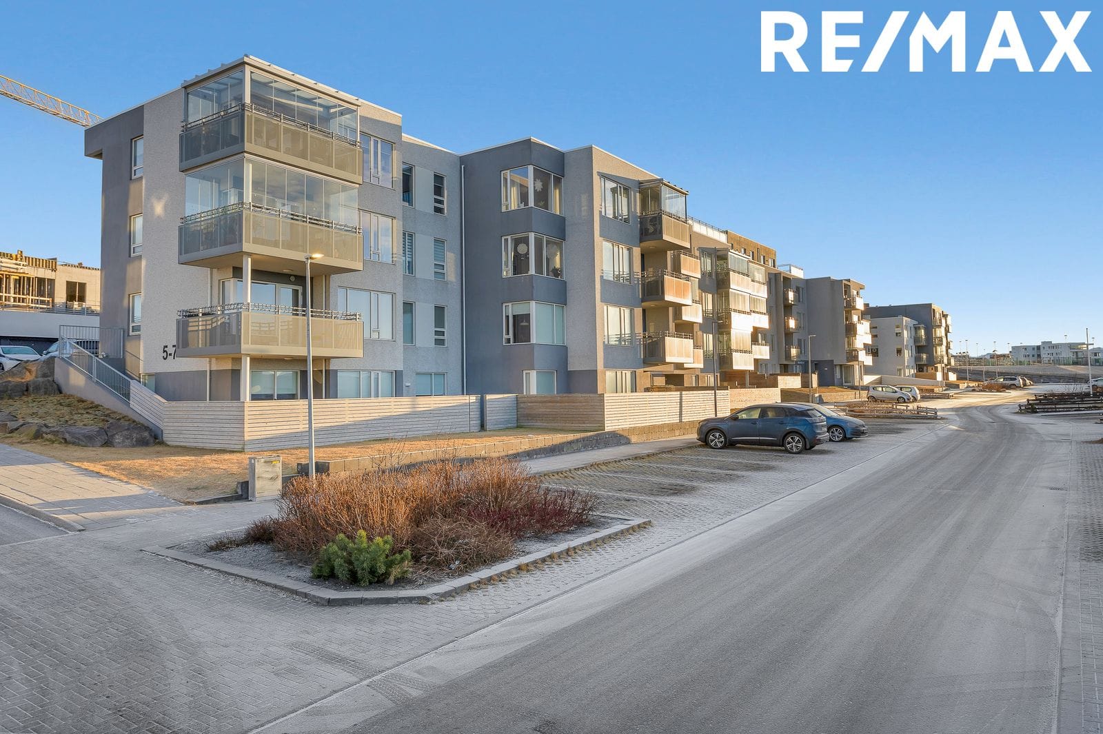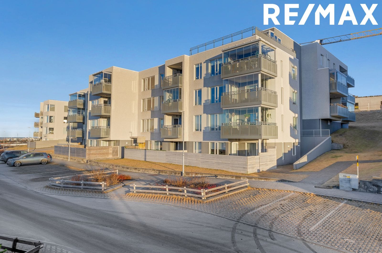Nánar um eignina: Sérinngangur er í íbúðina. Forstofa með tvöföldum fataskáp og flísum á gólfi. Eldhús með vandaðri innréttingu frá HTH, vönduð tæki frá AEG, tengi fyrir uppþvottavél, eyja með span helluborði, parket á gólfi. Stofa/borðstofa björt og rúmgóð með parketi á gólfi. Útgengt er út á rúmgóðar svalir úr stofunni með svalalokun og viðarhellum á gólfi. Hjónaherbergi rúmgott með góðu skápaplássi og parket á gólfi. Svefnherbergi II með fataskáp og parket á gólfi. Svefnherbergi III með fataskáp og parket á gólfi. Baðherbergi flísalagt í hólf og gólf. Baðkar með sturtuaðstöðu, snyrtileg hvít innrétting, upphengt salerni. Handklæðaofn. Þvotthús er innan íbúðar, gott vinnuborð með skolvaski, flísar á gólfi. Geymsla íbúðar er á jarðhæð. Bílskúr er með rafdrifinni hurð, flotað gólf, heitt og kalt vatn, skolvaskur og slöngutengi. Hjóla og vagnageymsla á jarðhæð og sameign öll hin snyrtilegasta.
