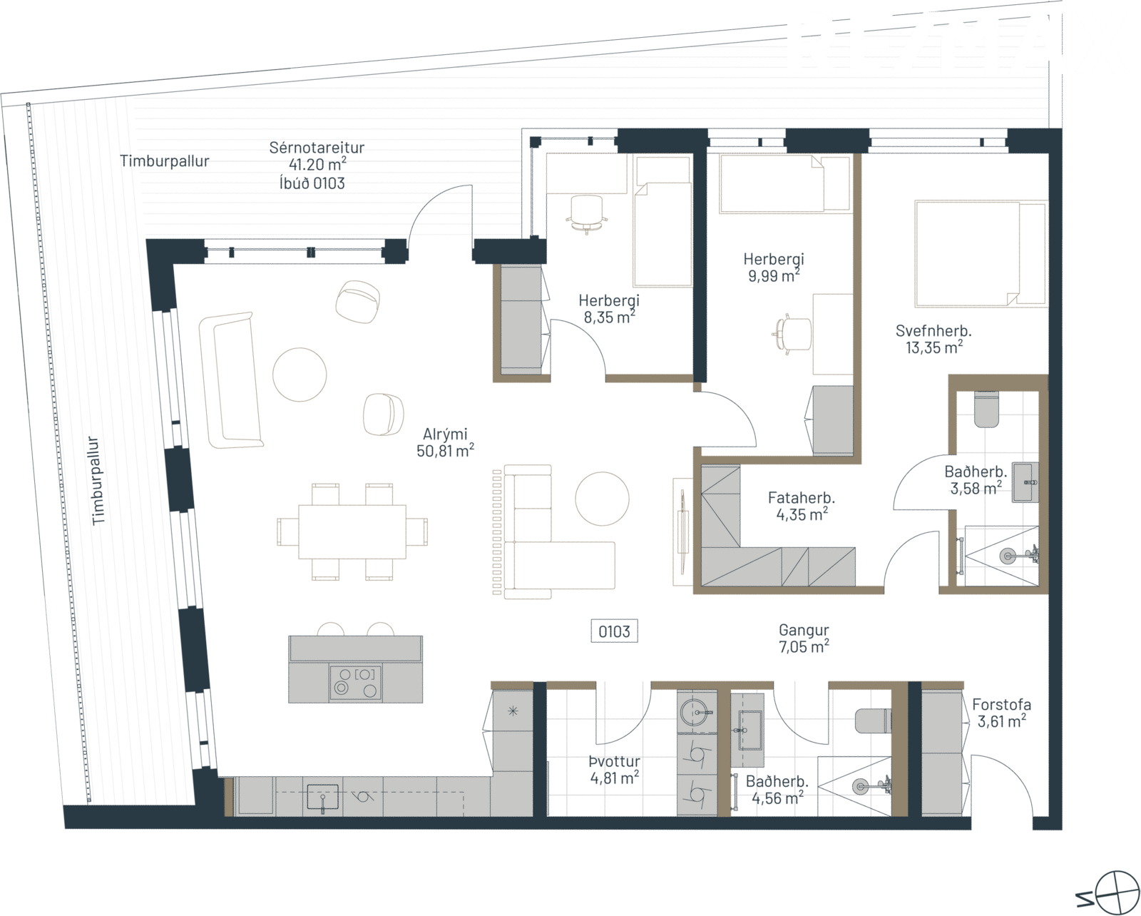 Íbúð 103 / Útsýnisíbúð: Rúmgóð og björt fjögurra herbergja, 135,7 m2 íbúð ásamt stæði í bílageymslu. Hjónasvíta með fataherbergi og sér baðherbergi. Gólfsíðir gluggar í stofu með stórbrotnu útsýni til sjávar og yfir borgina. Veglegur 41,2 fm sérafnotareitur með vönduðum bambus timburpalli.  Sér 7,4 m2 geymsla í sameign.