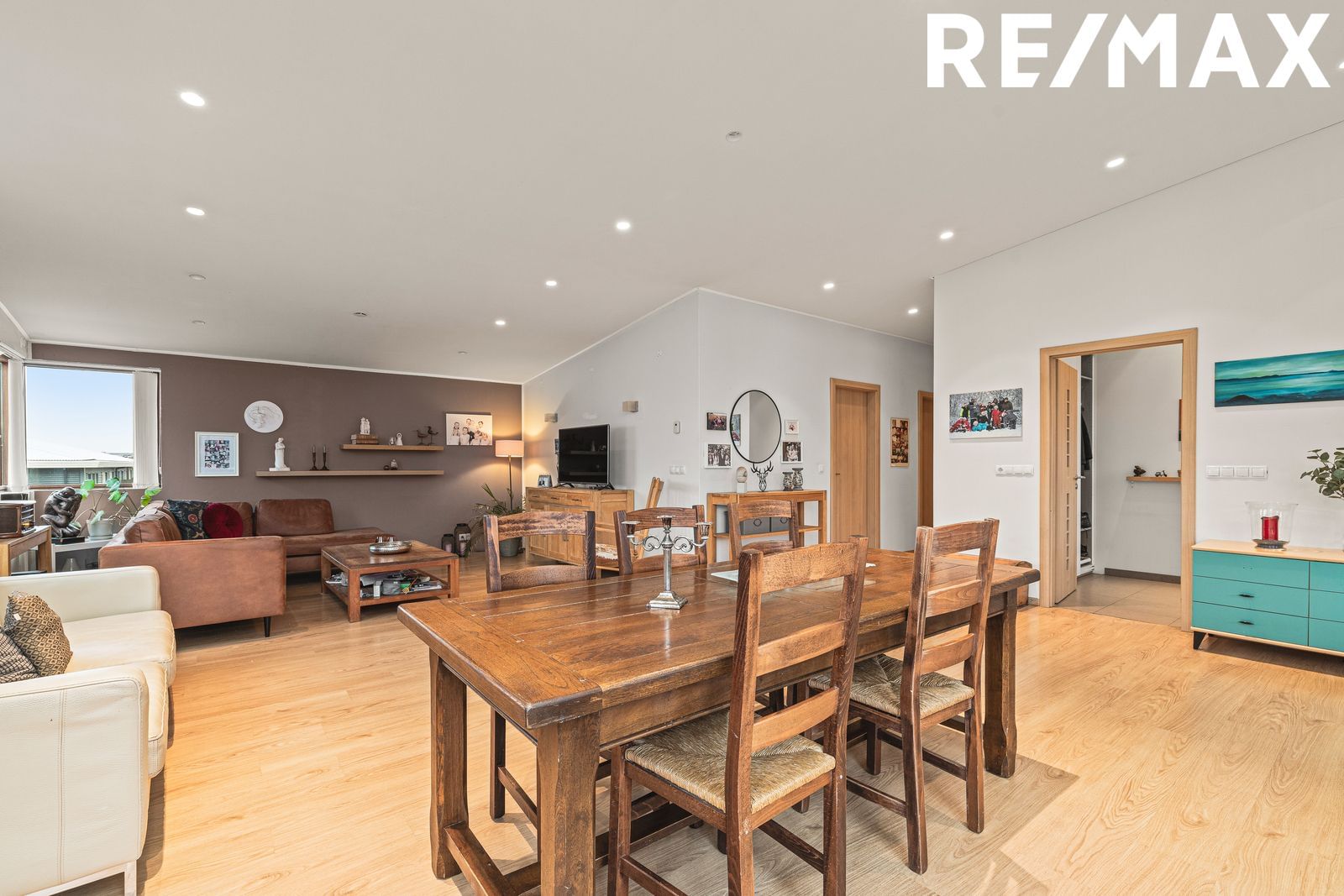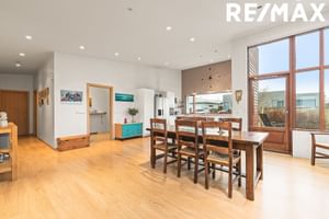 Stofa/Borðstofa: Stofa og borðstofa eru saman í flæðandi og rúmgóðu rými, með útgangi út á sólpall.