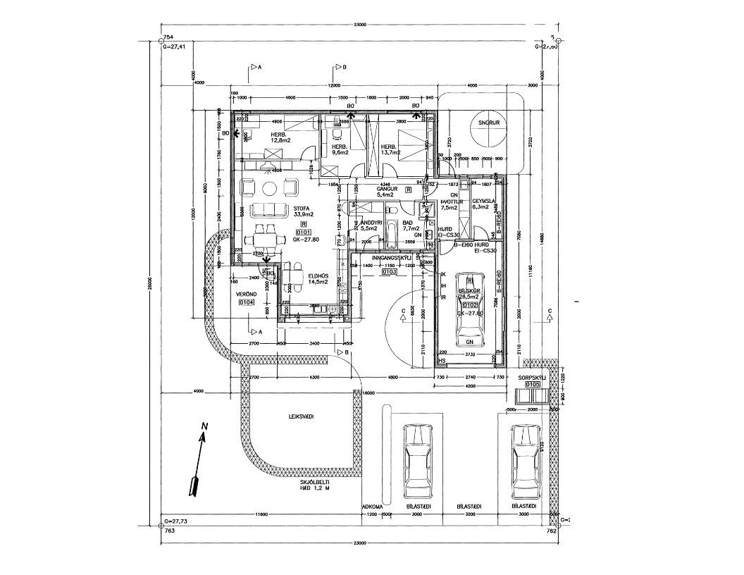 Burðavirki: Undirstöður og botnplata eru úr steinsteypu. Berandi útveggir eru almennt úr 45x120mm timburgrind, sem klædd er 11mm obs krossviði að utan til afstífingar og vindþéttingar. Brunamótstaða útveggna verður B-REI30. Berandi veggur á austurhlið verður klæddur báðu megin með 11mm obs plötum og 13mm gifsplötum. Brunamótstaða þessa útveggja verður B-REI60. Berandi inniveggur eru úr 45x95mm timbri, brunamótstaða B-EI30. Þök eru úr 45x220mm timbri. Brunamótstaða þaka er B-REI30 á íbúðarhúsi en B-REI60 á bílageymslu. Einangrun í berandi veggjum er jafn þykk og grindur, rúmþyngd 30kg/m3. Steinull í berandi byggingarhlutum var fest brunatæknilega rétt t.d. með 2mm stálvír c/c 300mm. Léttir veggir: Innveggir eru alment úr 35x70mm timbri. Veggur milli íbúðar og í bílskrúrs eru B-EI60. Hann er úr 45x120mm timbri. Í léttum veggjum er 70mm þykk þilull til hljóð- og brunaeinangrunar. Klæðning innanhús: Í íbúð eru klæðningar veggja og lofta 12mm spónarplötur, sem er klæðning í flokki 2. Klæðningar í bílageymslu, bæði veggja og lofta er 12mm securitiplötur, sem er klæðning í flokki nr.1. Klæðningar útanhúss: Klæðning útveggja er úr 6mm þykkum og sléttum steini-colour plötum, sem er klæðning í flokki nr.1. Stakir fletir útveggja eru klæddir sedrusarborðum, sem er klæðning í flokki nr.2 um er að ræða útveggi á eldhúsi og lítinn flöt á norðurhlið. Á þökum er pvc-þakdúkur, sem er klæðning í flokki T. Þak: Þakhalli er 7gr. á íbúðarhúsi en 1,2gr á bílgeymslu. Þak er klætt pvc-þakdúk á filtpappa og 18mm þakkrossvið. Loftbil yfir einangrun í þaki er loftræst um ø 32 rör, sem staðsett eru í hverju sperrubili. Loftþétt rakavarnarlag úr 0,20mm þolplasti er innan við einangrun í þaki og útveggjum. Langanleiðir: Hitalagnir eru staðsettar inna á útveggjum og gólfhiti er í öllu íbúðarhúsinu. Fráveitulagnir eru í grunni. Raftafla er í þvottahúsi og rafinntak er staðsett í bílageymslu einnig inntaksskápar fyrir kalt og heitt vatn, um er að ræða inntaksskápa samkvæmt lac-140 frá orkuveitu Reykjavíkur. Innihurðagöt: Göt innihurða eru öll 880x2100mm. Loftræsting: Öll rými hússins eru loftræst um opnanleg gluggafög. Gluggar: Í húsinu eru gluggar og útihurðir úr harðviði.
