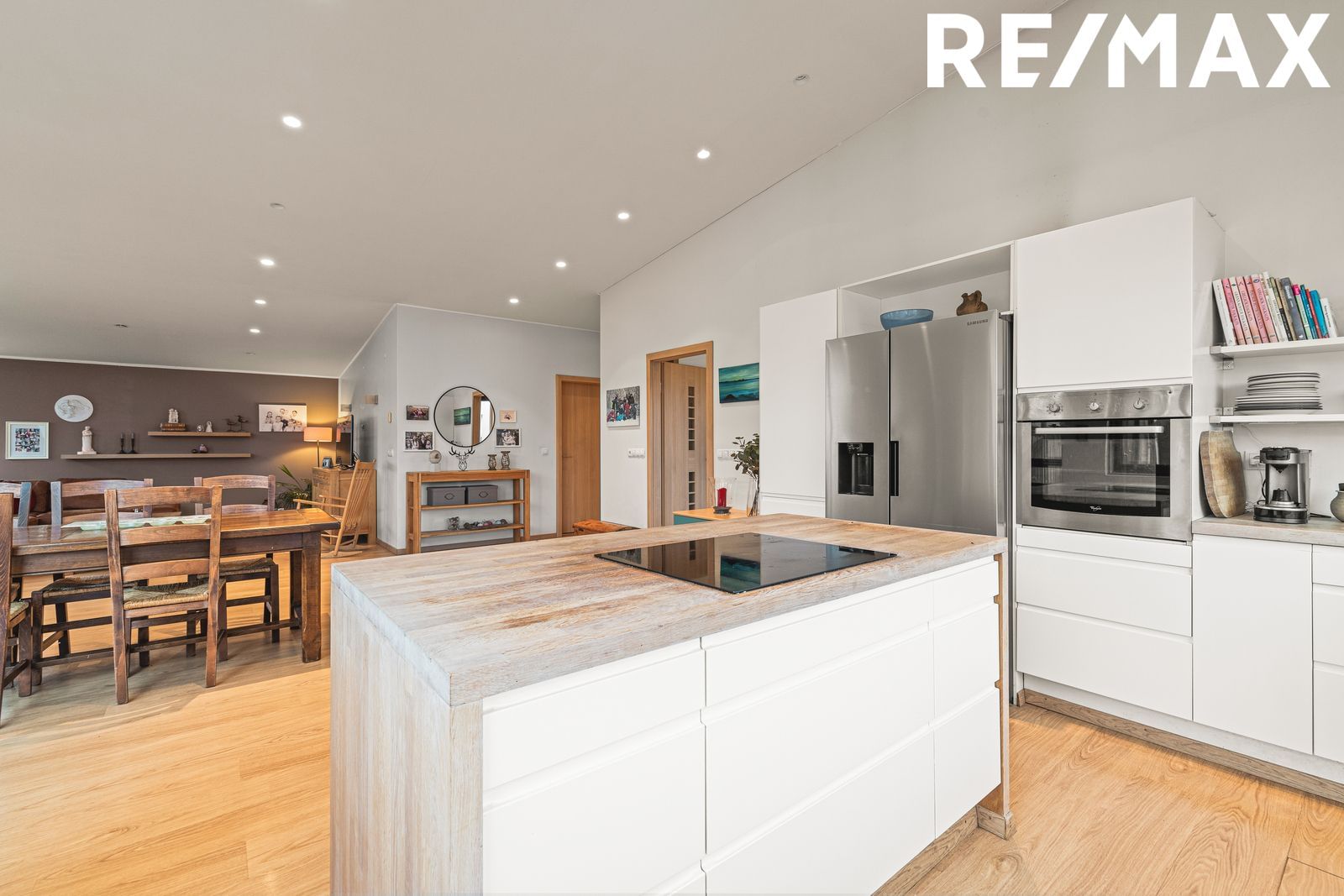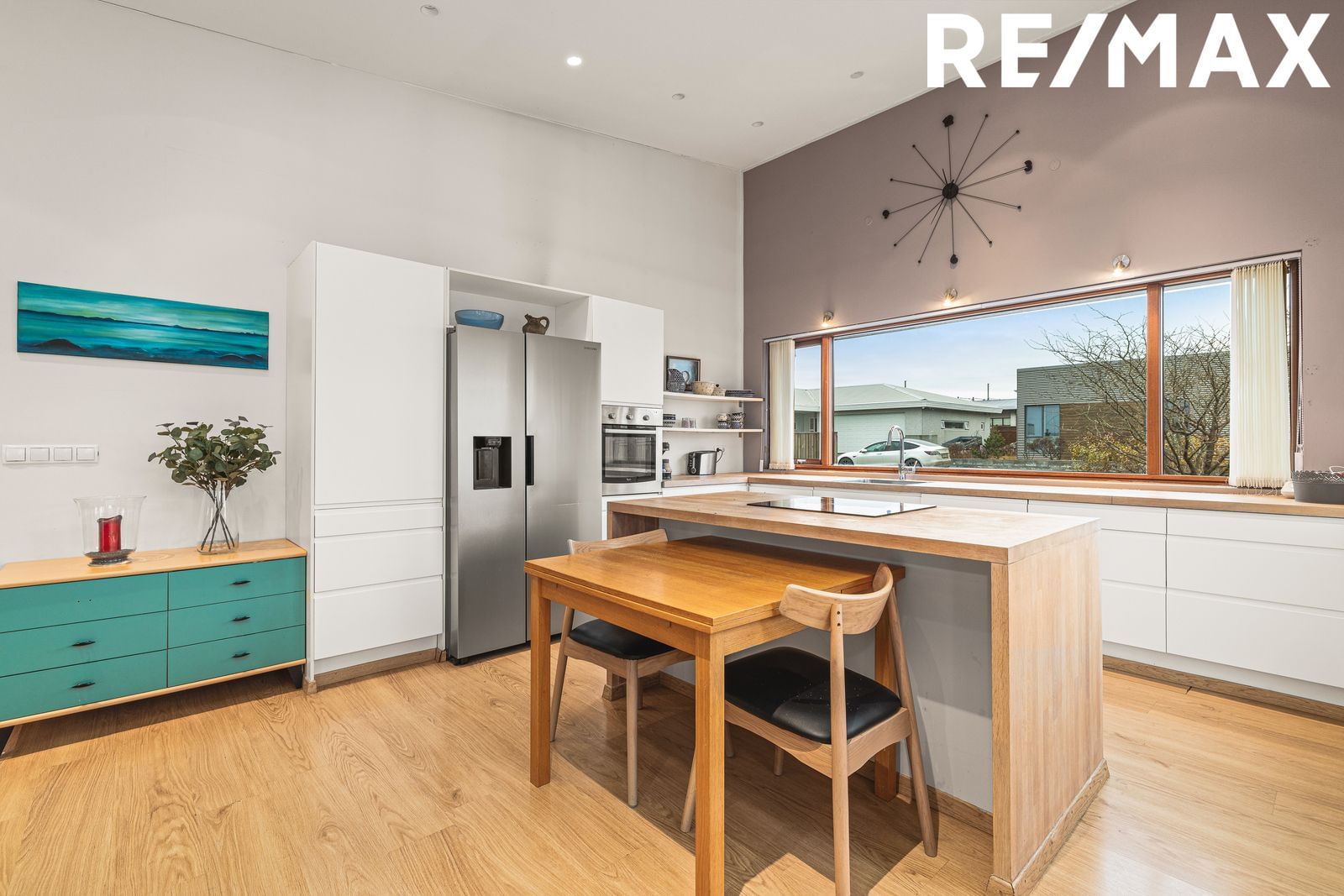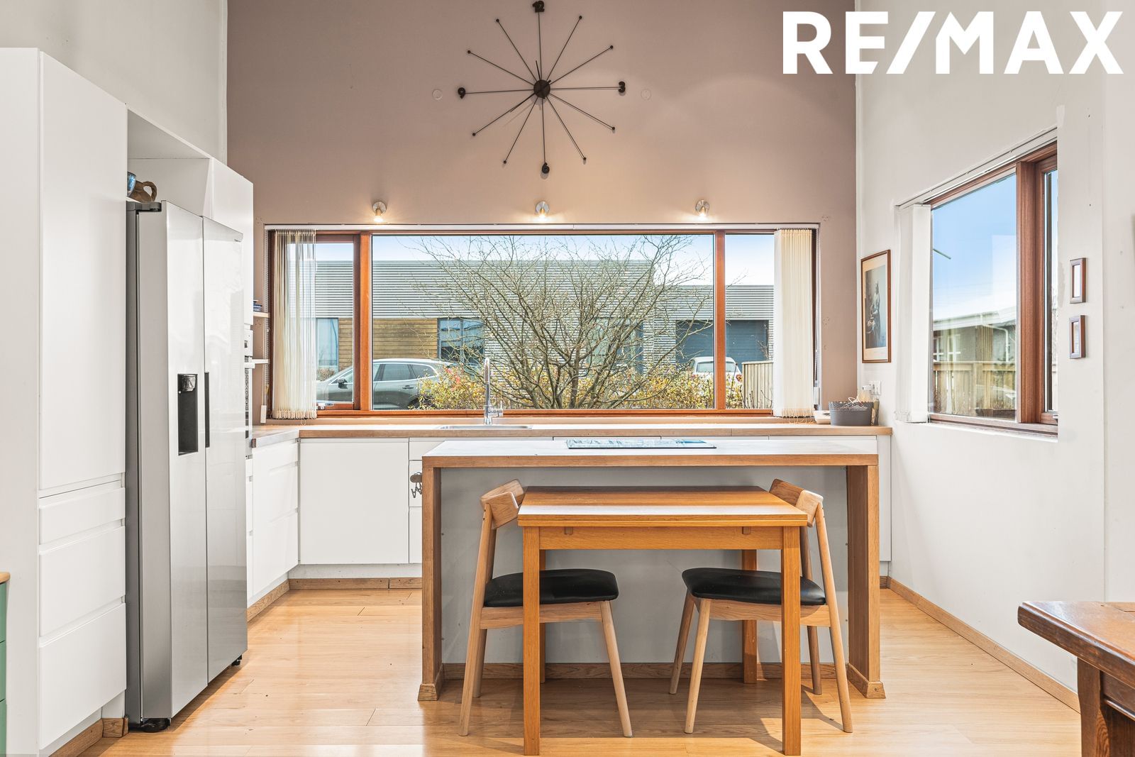 Eldhúsi: Er bjart og opið með stórum gluggum, góðu skúffu- og skápaplássi ásamt eyju með helluborði, bakaraofn er í vinnuhæð.
