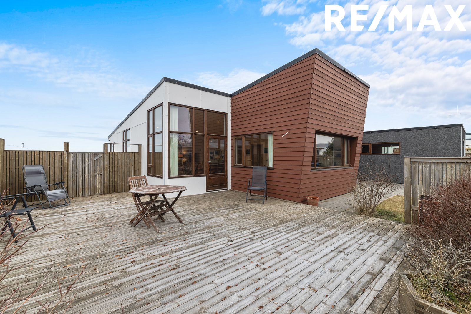 Verönd/pallur: Gengið er úr borðstofu á rúmlega 50fm sólpall og gróin garð.