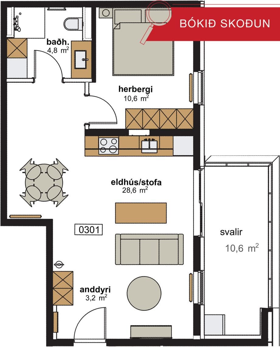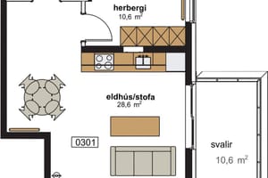 Íbúð 301: 58,4 fm 2ja herbergja íbúð á 3. hæð. Íbúðin er 54,4 fm ásamt 4,0 fm geymslu.